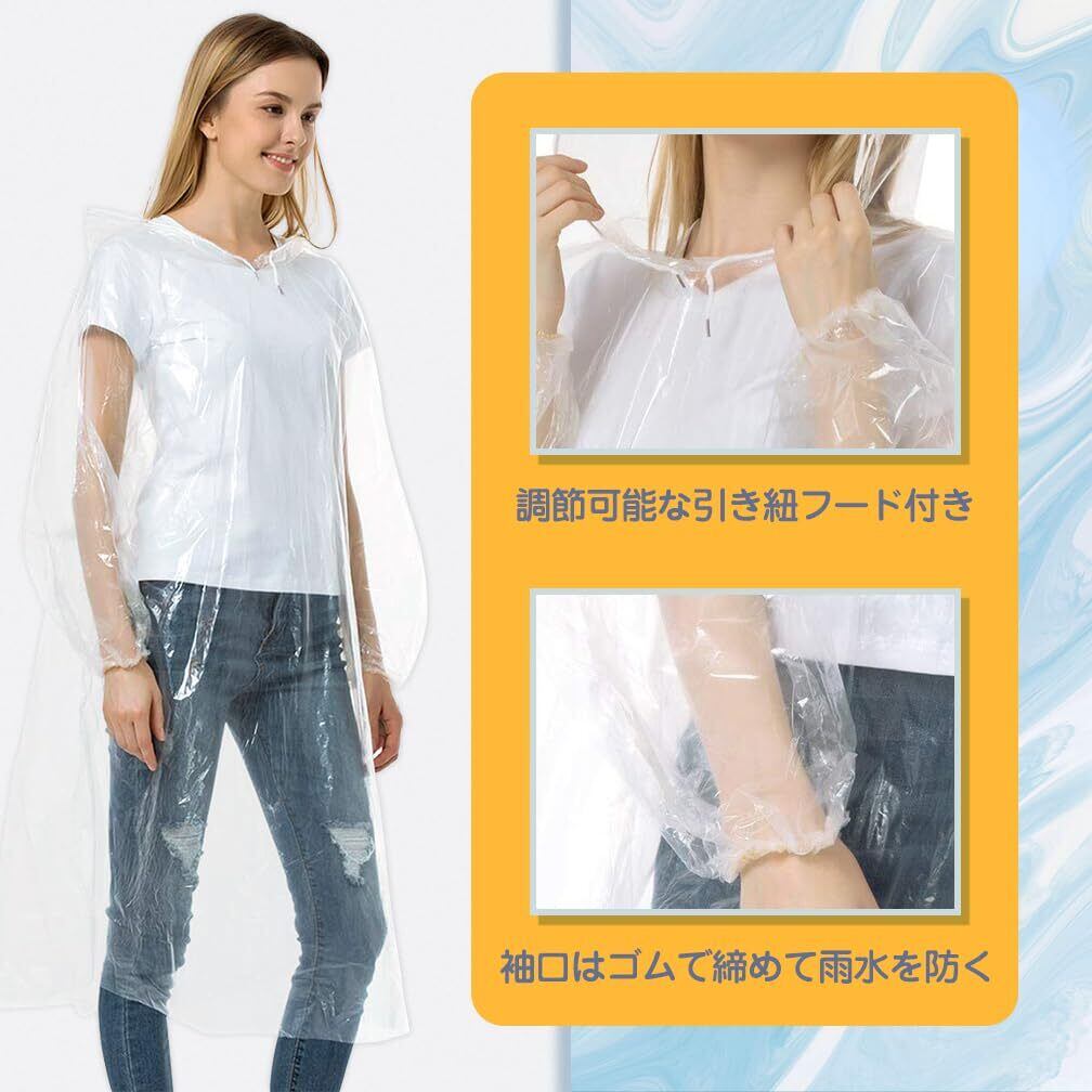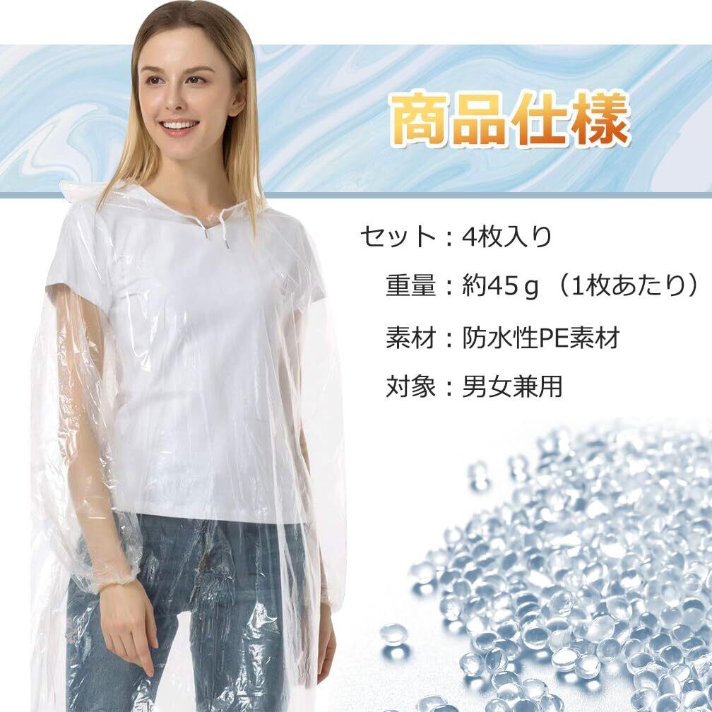 【商品仕様】 パッケージ内容:4枚セット サイズ:フリーサイズ(男女兼用)着丈:約135cm(フード部分含め)身幅:約85cm袖丈:約75 cm重量:約45g(1枚)色:透明 素材:防水性PE素材