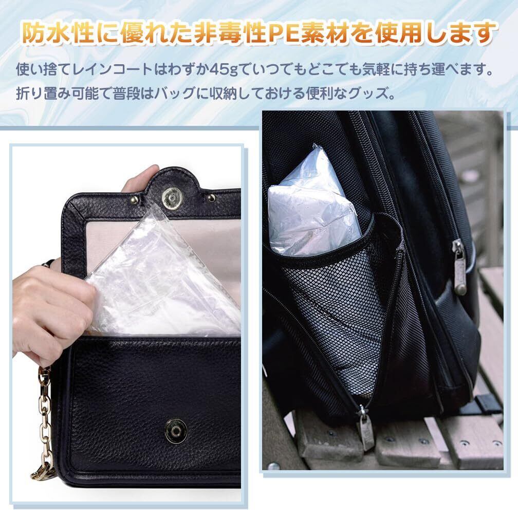 【持ち便利】 折り畳み可能で普段はポケットやバッグ等に収納しておけるので持ち便利です。梅雨の時期はもちろん、イベント時の急な雨、秋の台風シーズンまで普段使いのバッグの中に常備しておきたい使い捨てレインコートです。旅行バッグやトランクの中に入れておけば、予測のつかない旅先の天候変化も気にせず過ごせます。