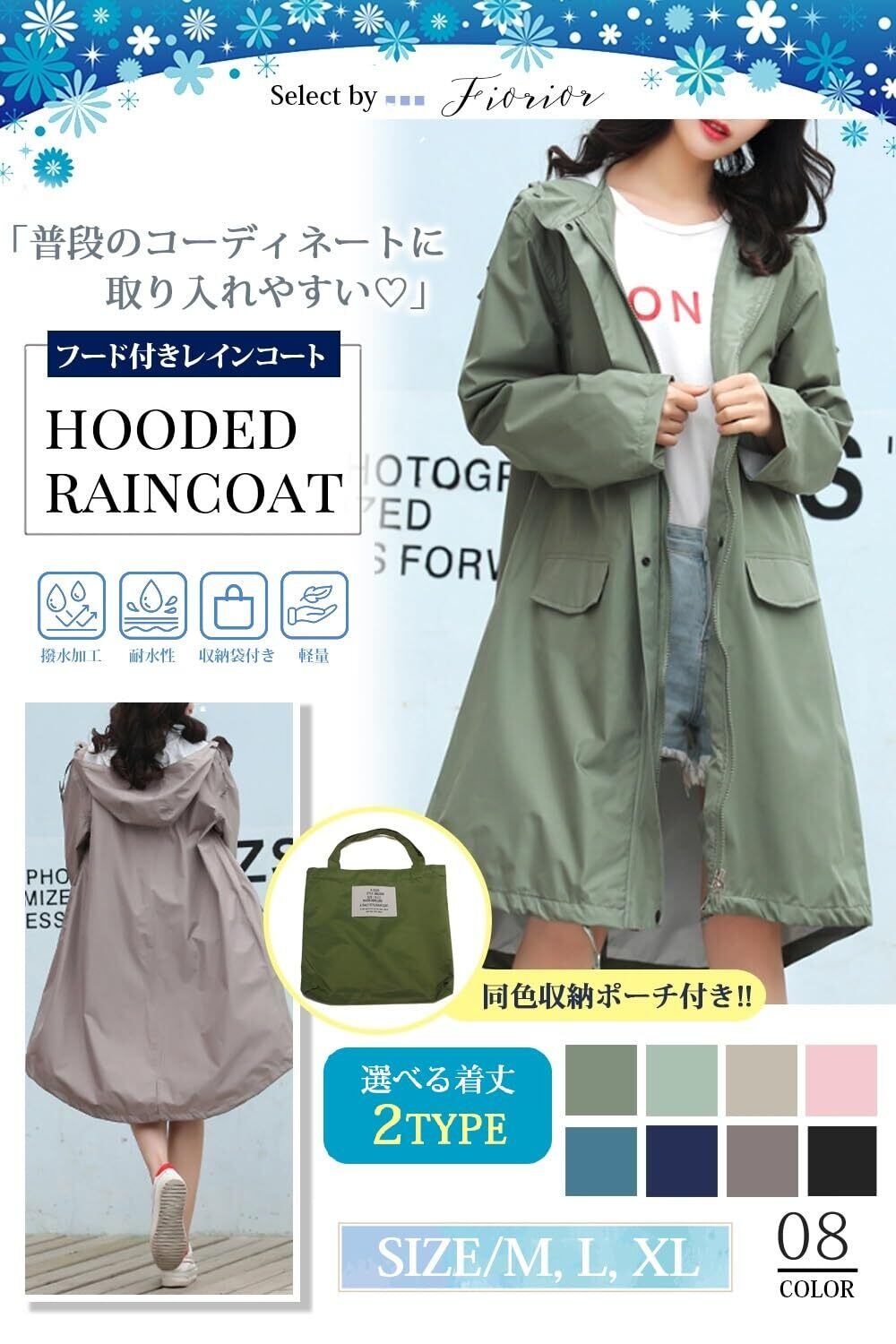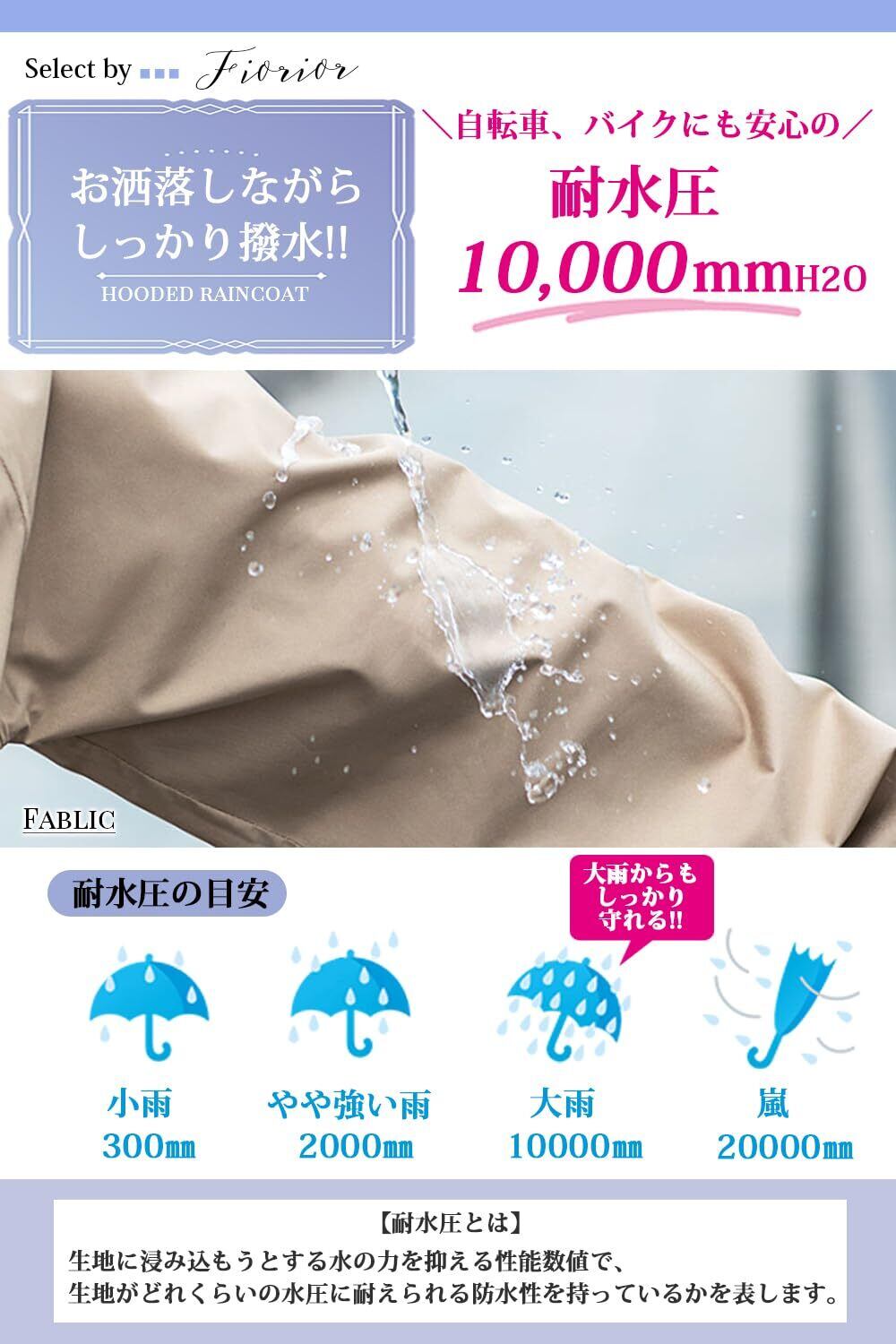 [Fiorior]のレインコートは、膝丈とロング丈の2種類から選べ、好みに応じたスタイルを楽しめます。洗練されたシルエットが女性らしさを引き立て、通勤や通学、出かける際にも大活躍。おしゃれを楽しむあなたにぴったりのアイテムです!