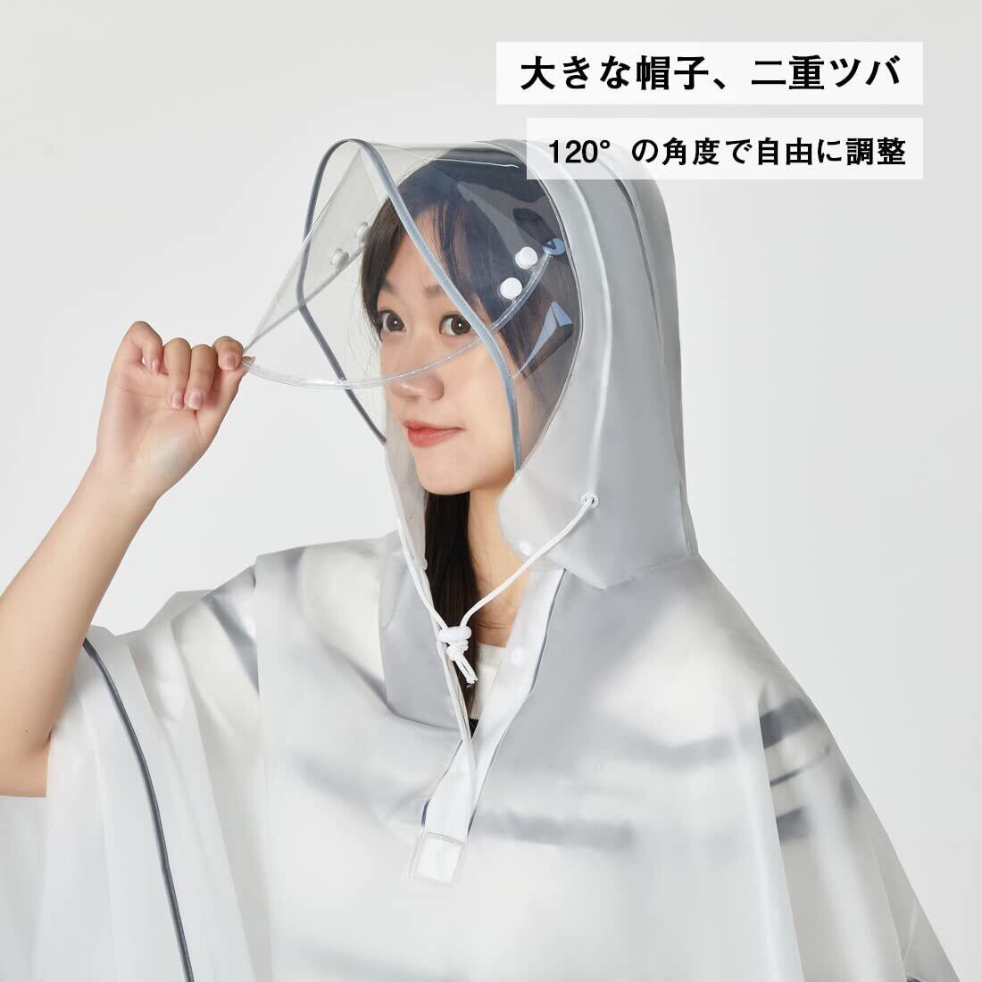 大きな二重ツバ付き 自転車 レインコート:薄いフィルムが両面に貼られた二重つばのレインコートは、はがすと綺麗に取れます。PVC透明フィルムの設計により、視界が良く、クリアな視界を確保しながら飛沫防止や風・雨・雪対策ができます,120度の角度でつばを自由に調整でき、顔をしっかり守ります。女性でも雨の日に化粧が崩れることはありません。また、ロープがついているためフードのサイズを調整でき、雨水の浸入を防ぐこともできます。自転車やバイク、原付きなどを運転するときにとても便利です。