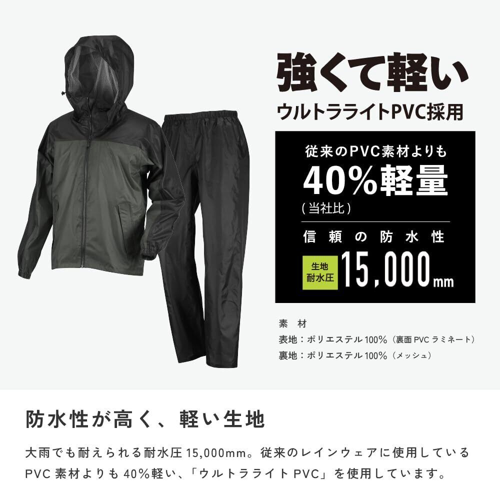 信頼の防水性 生地耐水圧15,000㎜ 本体生地は強くて軽いウルトラライトPVC採用※従来PVC素材よりも40%軽量(当社比)・軽い、丈夫、動きやすい 作業からまで安心の防水レインスーツ 通勤通学、現場作業、レジャーに最適。・ヘルメット対応フード、3Dカッティングで肩や腕周りの動き抜群
