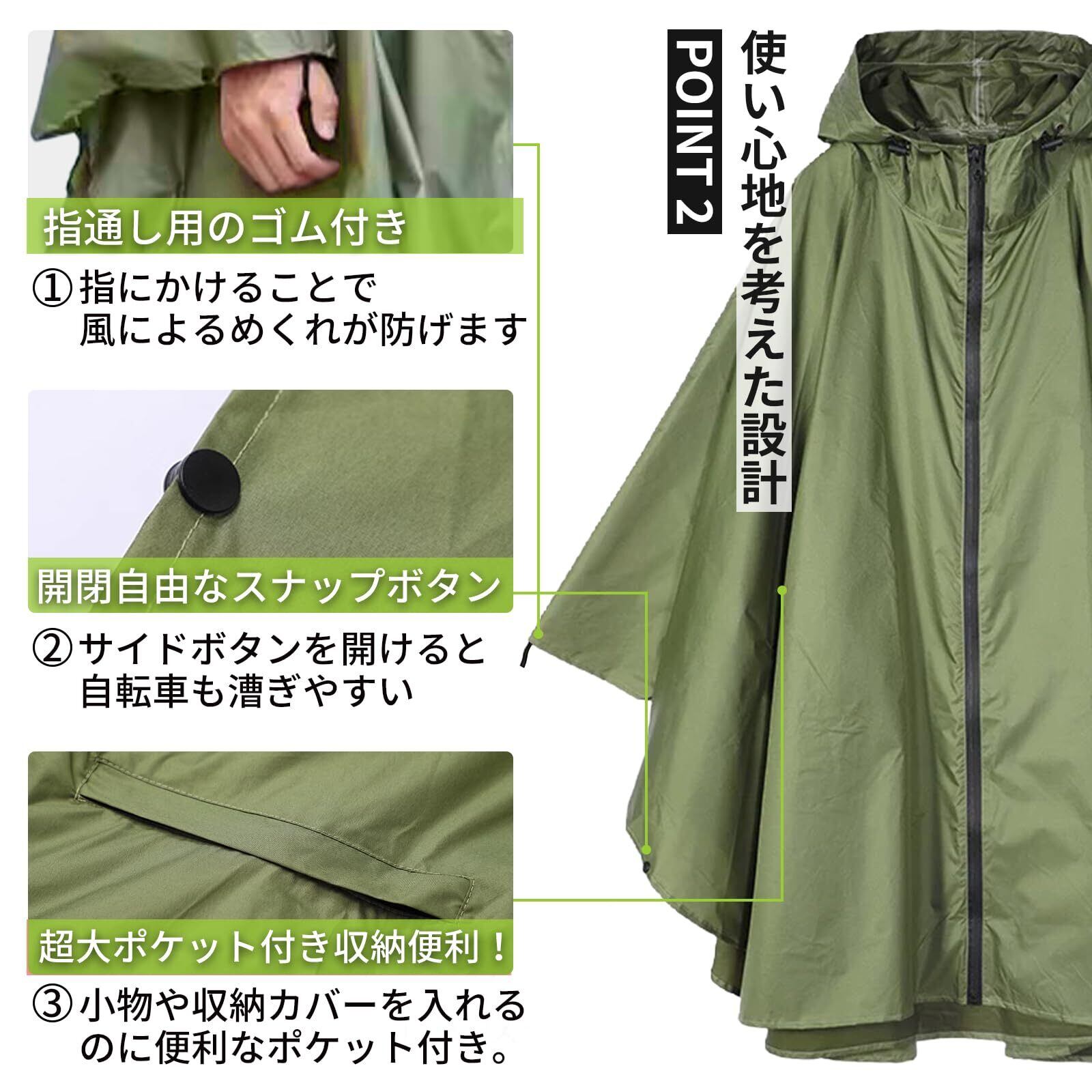 【人間化されたデザイン】 ①このレインコートは膝下までしっかりカバーできる長さで、男女兼用のゆったりシルエットが特徴です。②側面のボタンを開ければ、大容量のリュックやバッグを背負ったままでも快適に着用できます。③帽子には調節可能なストラップが付いており、自由に調節が可能。さらに、大きめのツバは雨水をしっかり防ぎます。④レインコートの縁にはハトメが付いており、テント用の杭に固定してマットやサンシェードとしても活用可能です。⑤前面には大容量の防水ポケットがあり、雨天でも必需品を安全に携帯できます。