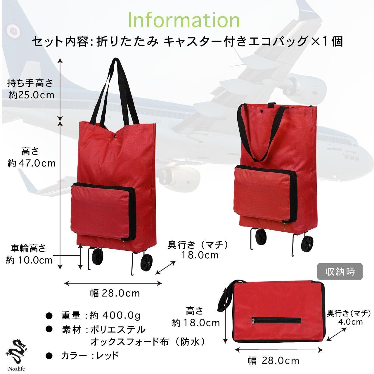 【商品仕様】セット内容:キャリーカート 折りたたみ キャスター付きエコバッグ×1個 サイズ (展開時)高さ 約47.0cm 幅 28.0cm 奥行き(マチ) 18.0cm 手提げ紐高さ 約25.0cm(収納時)高さ 約18.0cm 幅 28.0cm 奥行き(マチ) 4.0cm 重量:約400.0g キャスター部 車輪高さ 約10.0cm 素材:ポリエステル オックスフォード布(防水) カラー:レッド ※モニターの環境等により、色の見え方に若干差が生じる場合がございます。