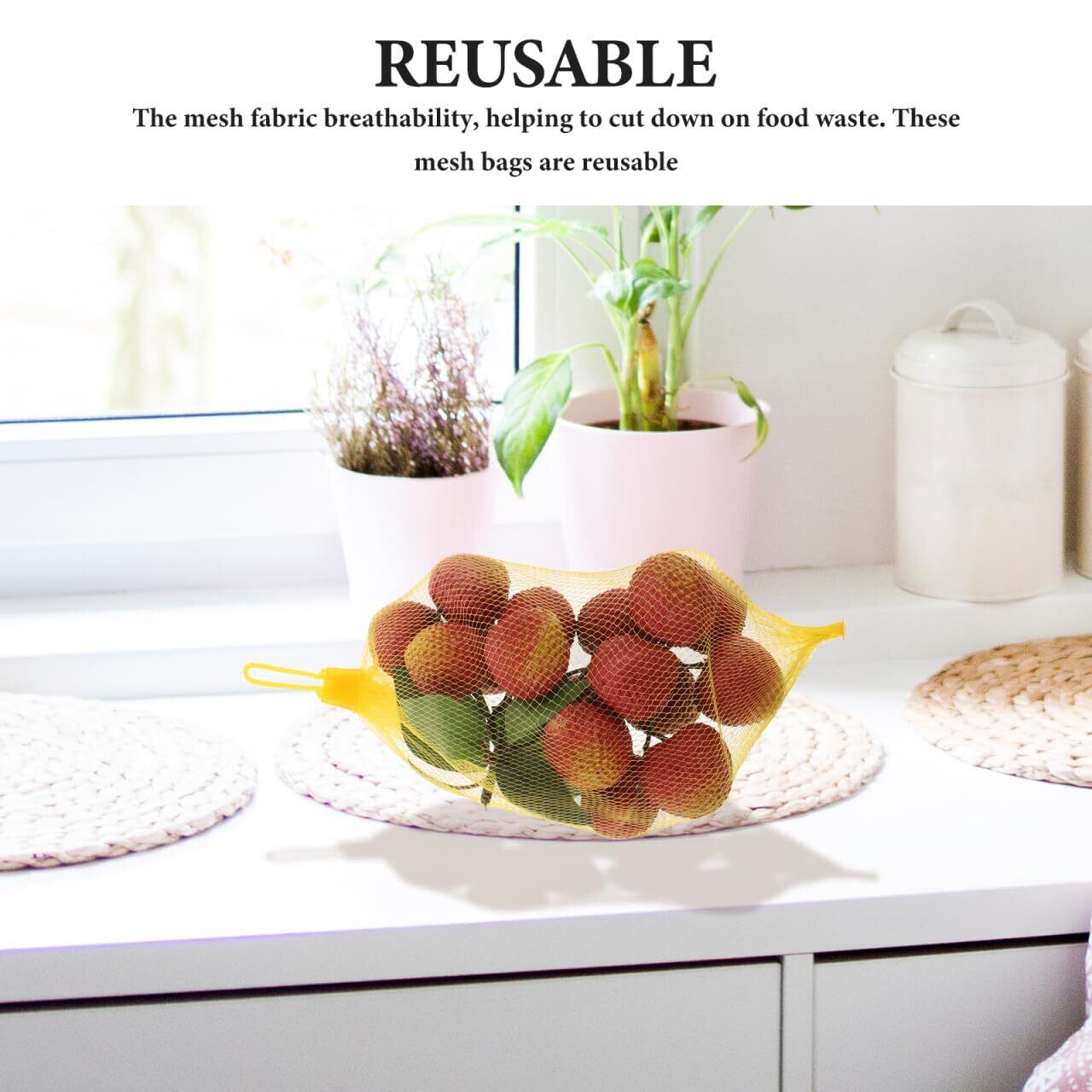 - メッシュ生地の通気性により、食品廃棄物の削減に役立つこれらのメッシュバッグは、再利用可能な大型メッシュバッグです。