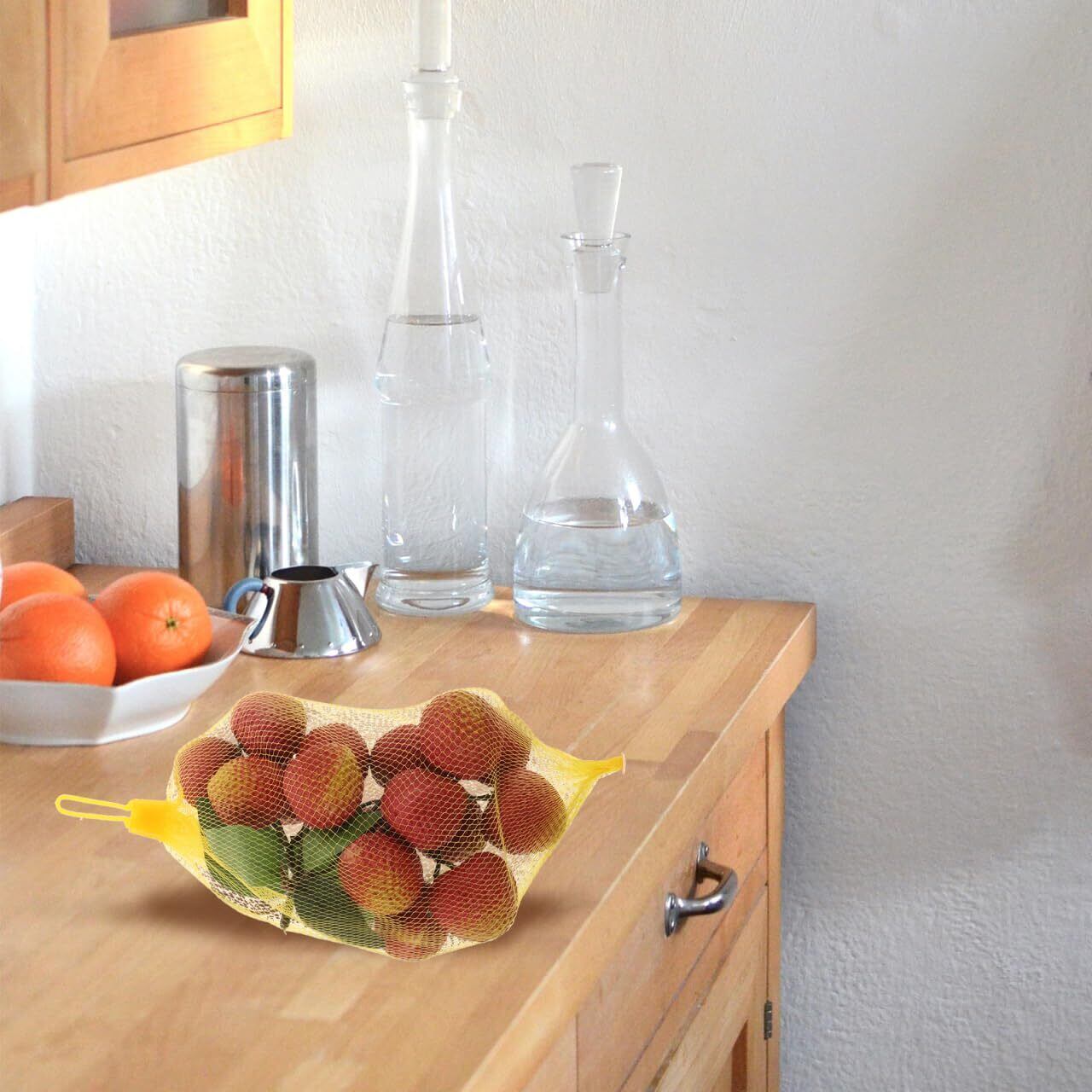 - 果物、野菜、魚介類、ナッツなど、さまざまな商品に適したメッシュ農産物バッグ。
