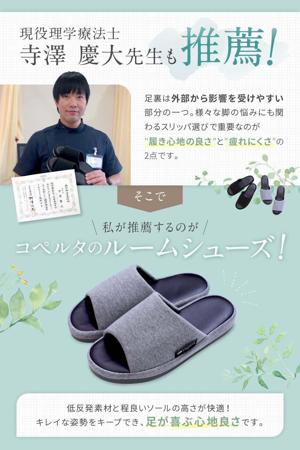 Copertaのルームシューズは、超軽量な作りで、足を優しく包み込む絶妙なフィット感が特徴です。疲れにくいデザインで、長時間の使用でも快適な履き心地を体験できます!