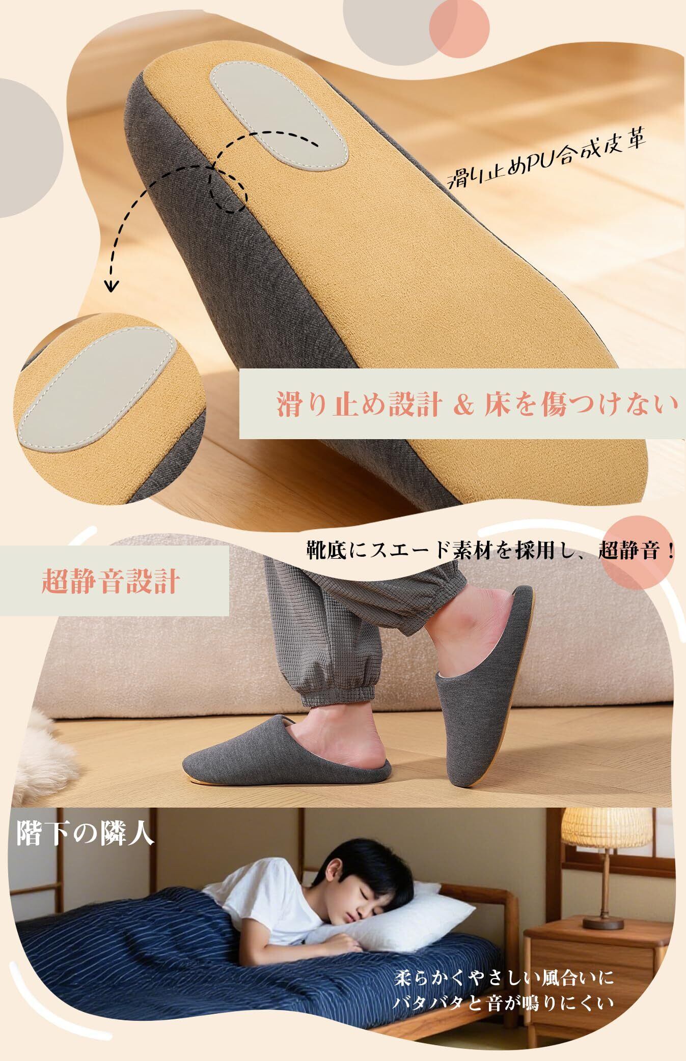 特別な滑り止めソールを採用しており、玄関や廊下など滑りやすい場所でも安心して歩行できます。静音設計のおかげで歩行音も気にならず、家の中での移動も快適です!