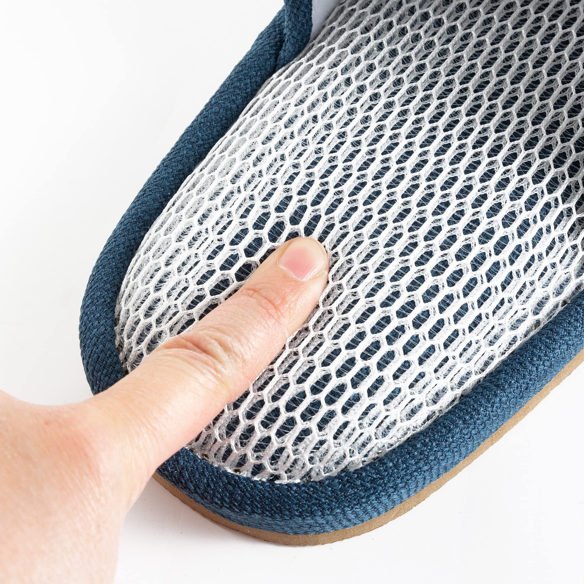 ムシムシする夏も足元快適。 mianshe製クッション入ダブルメッシュ生地使用。足裏の通気性がよく、蒸れを逃します。W構造だがら、強いクッション性で柔らかな履き心地です。
