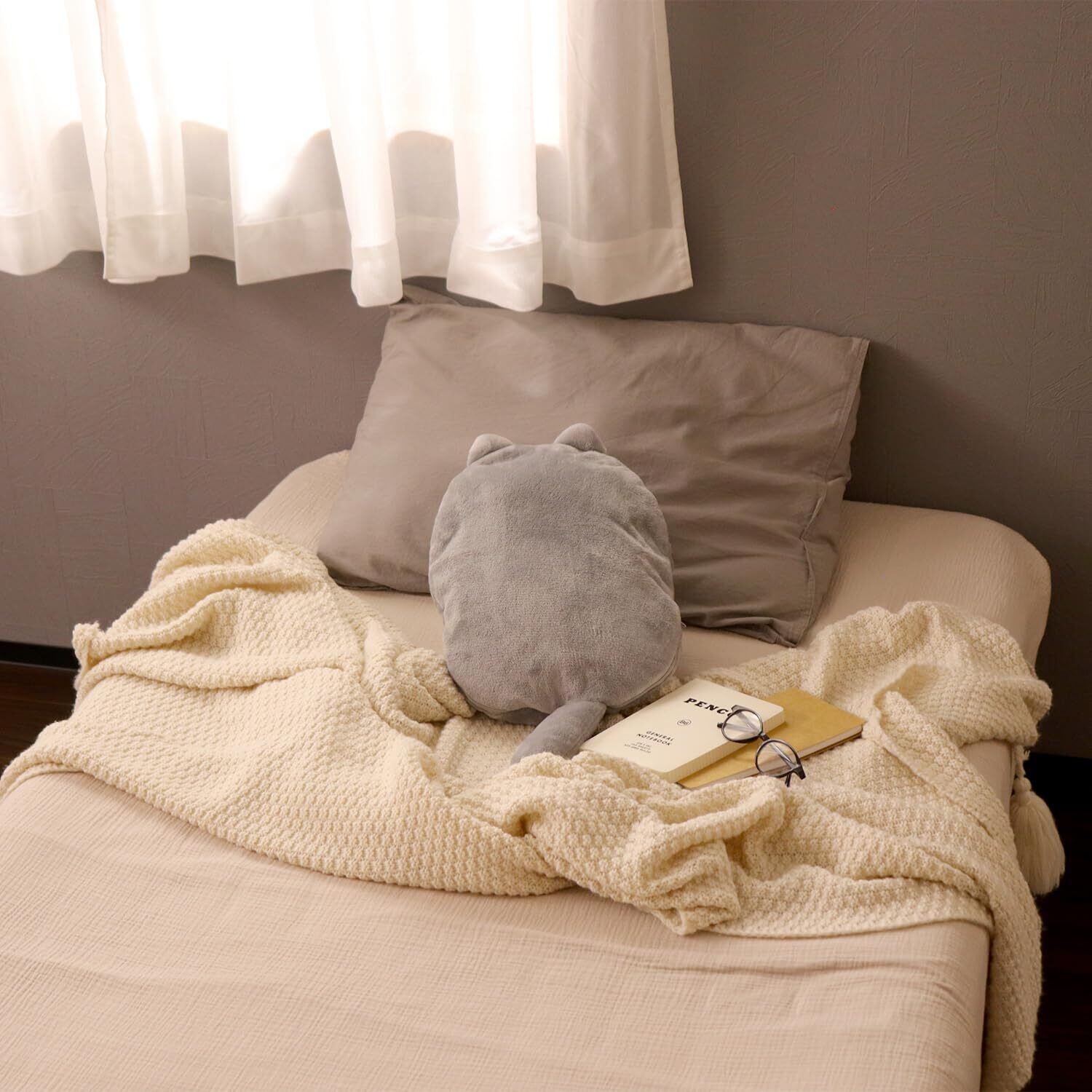 【Point2】 カバーにはそれぞれ、かわいいしっぽと耳がついています。 ふわふわで柔らかい、なでごこち。 手洗いOK!