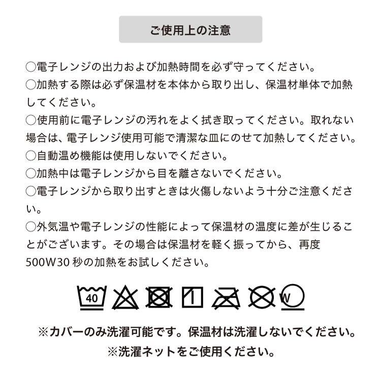 ・加熱後の温度:40℃前後(電子レンジ500W 30秒の加熱をした場合)