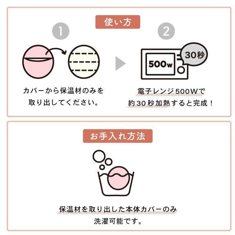 【使い方】本体カバー裏側のポケット部分からシリカゲルビーズ入りの袋を取り出し、電子レンジ500Wで約30秒温める。
