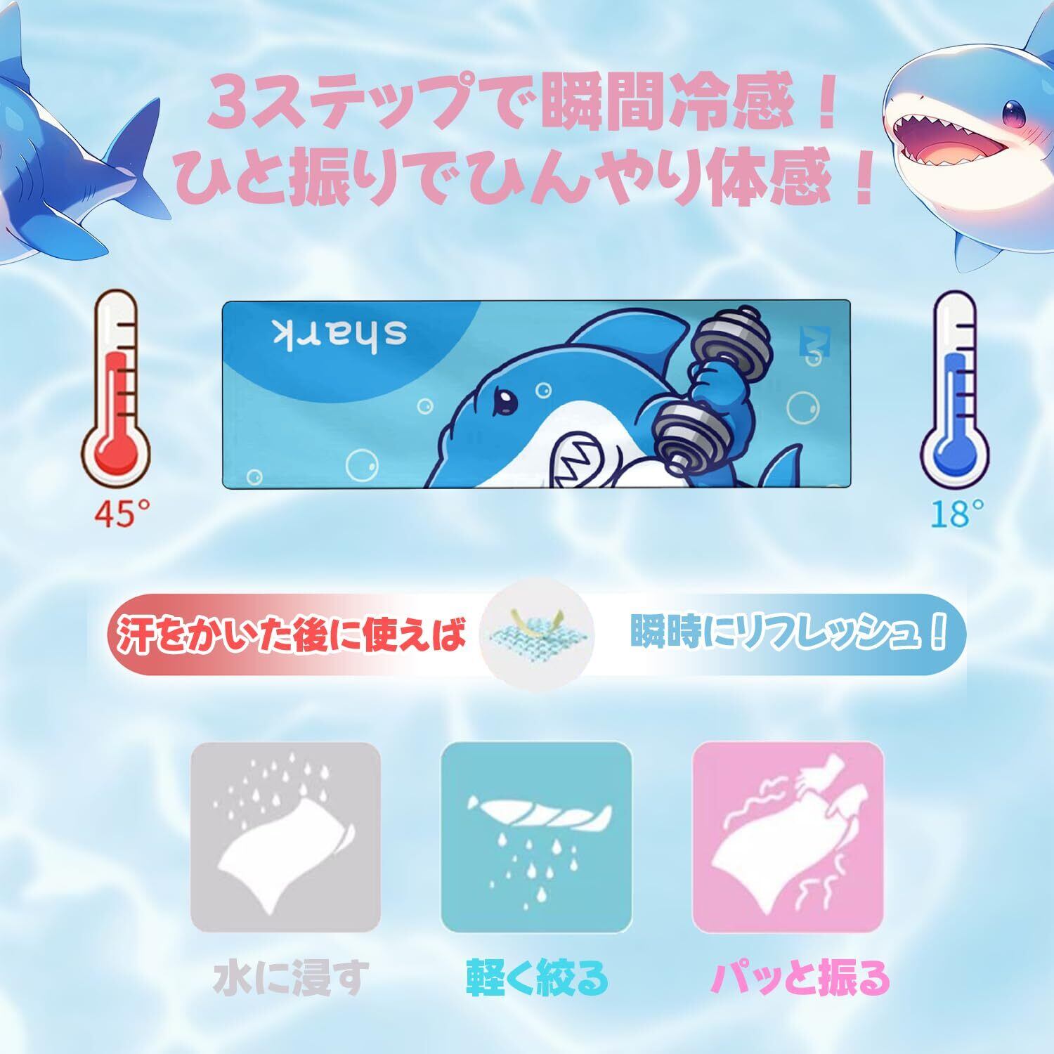 このタオルは、水で濡らして絞り、振るだけで瞬時に冷却が可能。体温を下げる効果を実感できるため、特に暑い日のお出かけ時や運動時に活躍します。