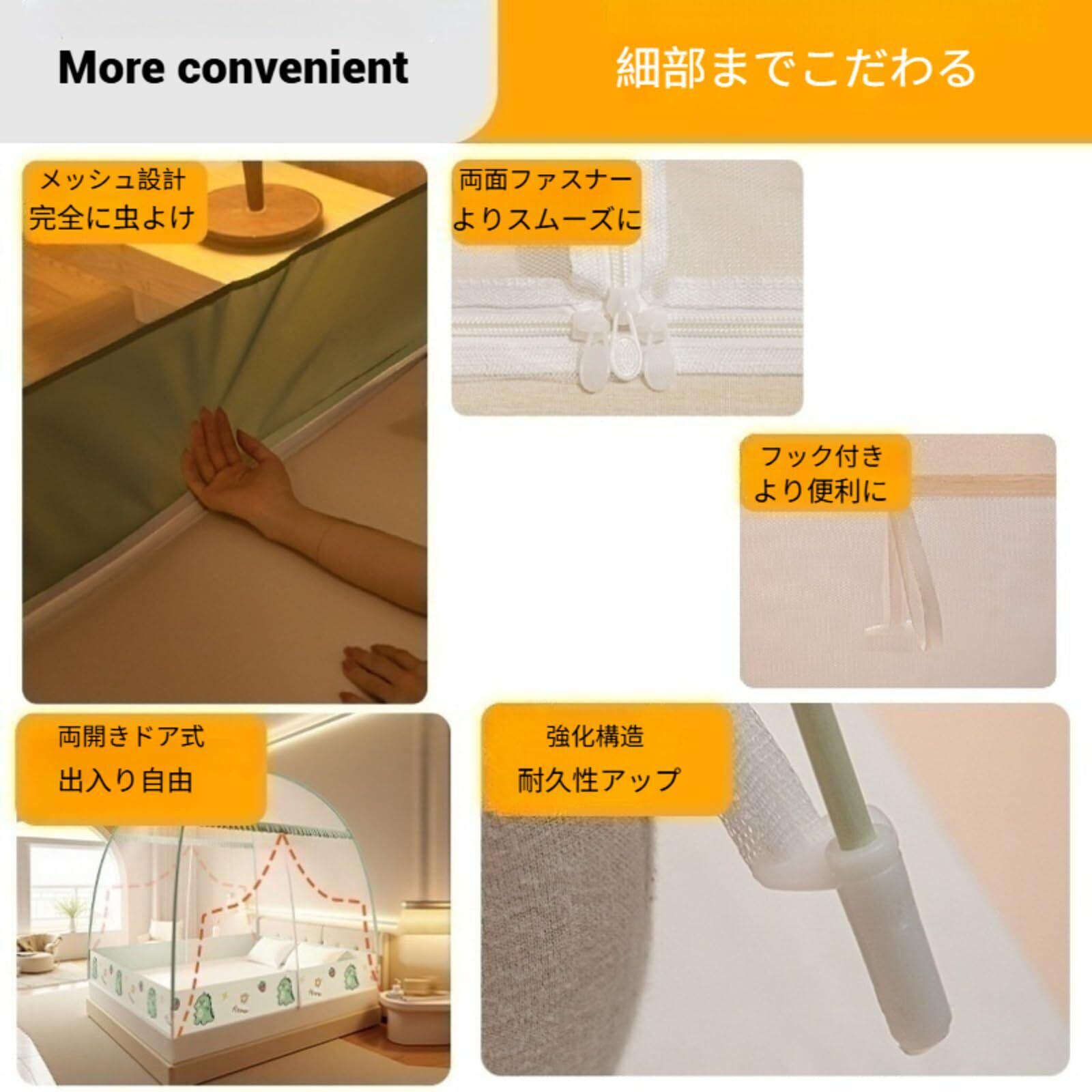 【スペースアップ・ダブルドア】快適性と利便性を徹底的に追求した設計です。上部をワイドに拡大したことで、蚊帳の内部空間が広々と確保されており、寝返りや起き上がりもストレスフリー。両開きのダブルジッパーを採用したこの蚊帳なので、どちら側からでもスムーズに出入りできます。さらに、蚊帳の天井部分には調節可能な固定バンドを装備。小型扇風機や照明などの小物を吊り下げられるので、夏の暑い夜も涼しく過ごせます。