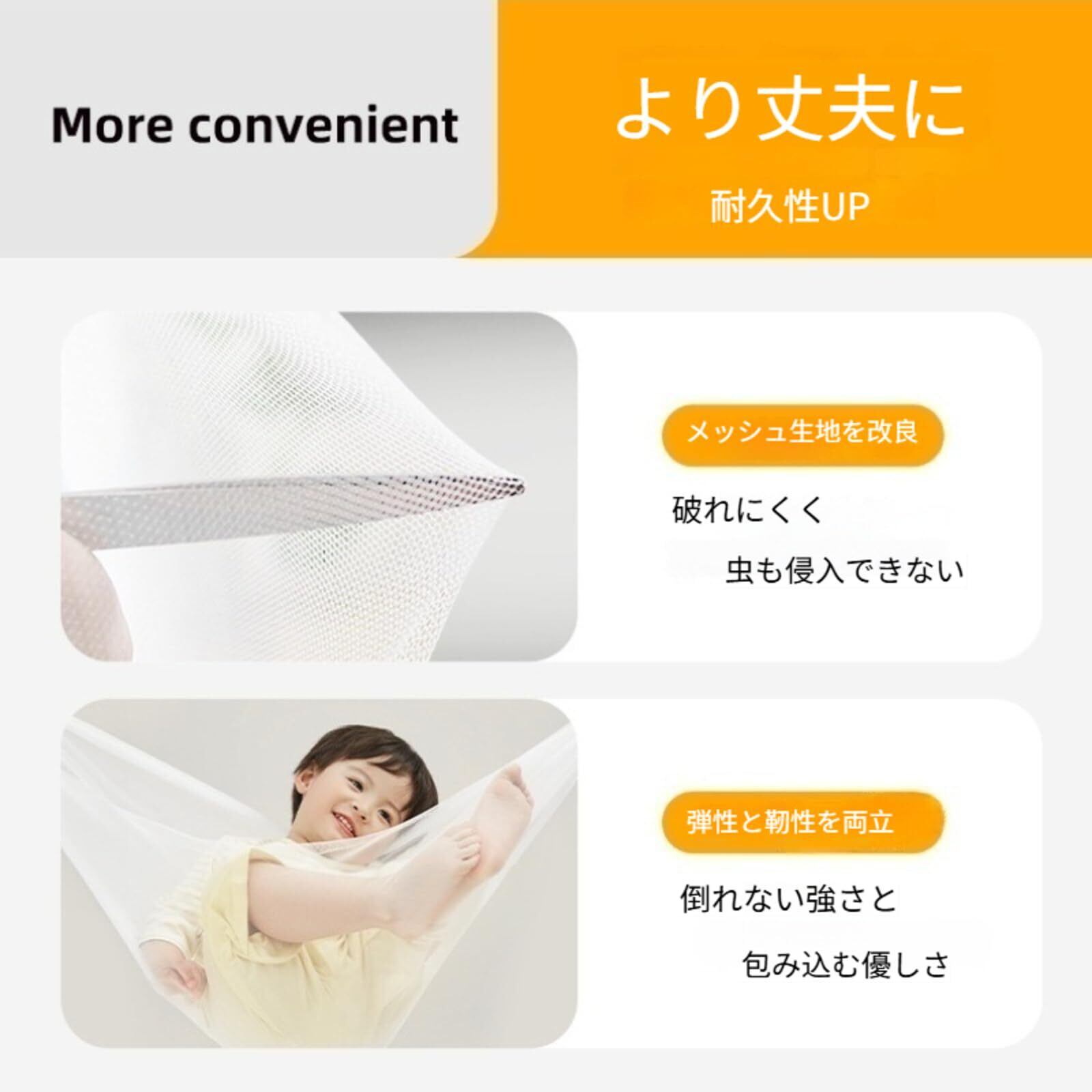 通気性の良い高密度素材を使用しているため、熱がこもらず涼しく快適です。細かなメッシュ素材が蚊の侵入を防ぎ、安心してリラックスできる空間を提供します。小さなお子様がいる家庭でも、安全にお使いいただけます。