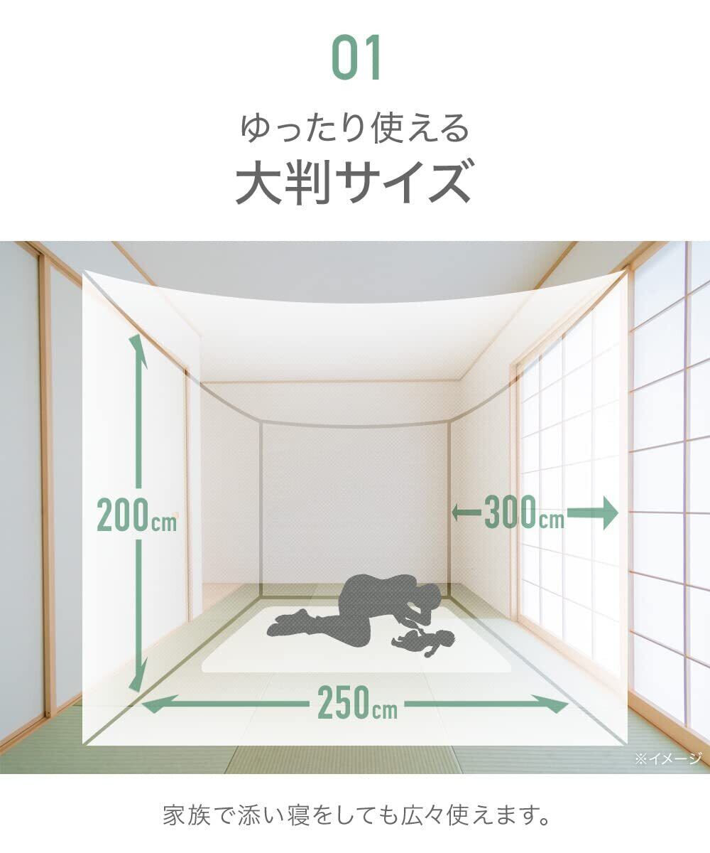 このUPstoreの蚊帳は、**300cm×250cmの大判サイズで、6畳分の広さを誇ります**!家族全員が快適にお使いいただける広々とした空間を提供し、リラックスした夜を楽しめます。特にベビーやお子様がいる家庭には安心の設計です。