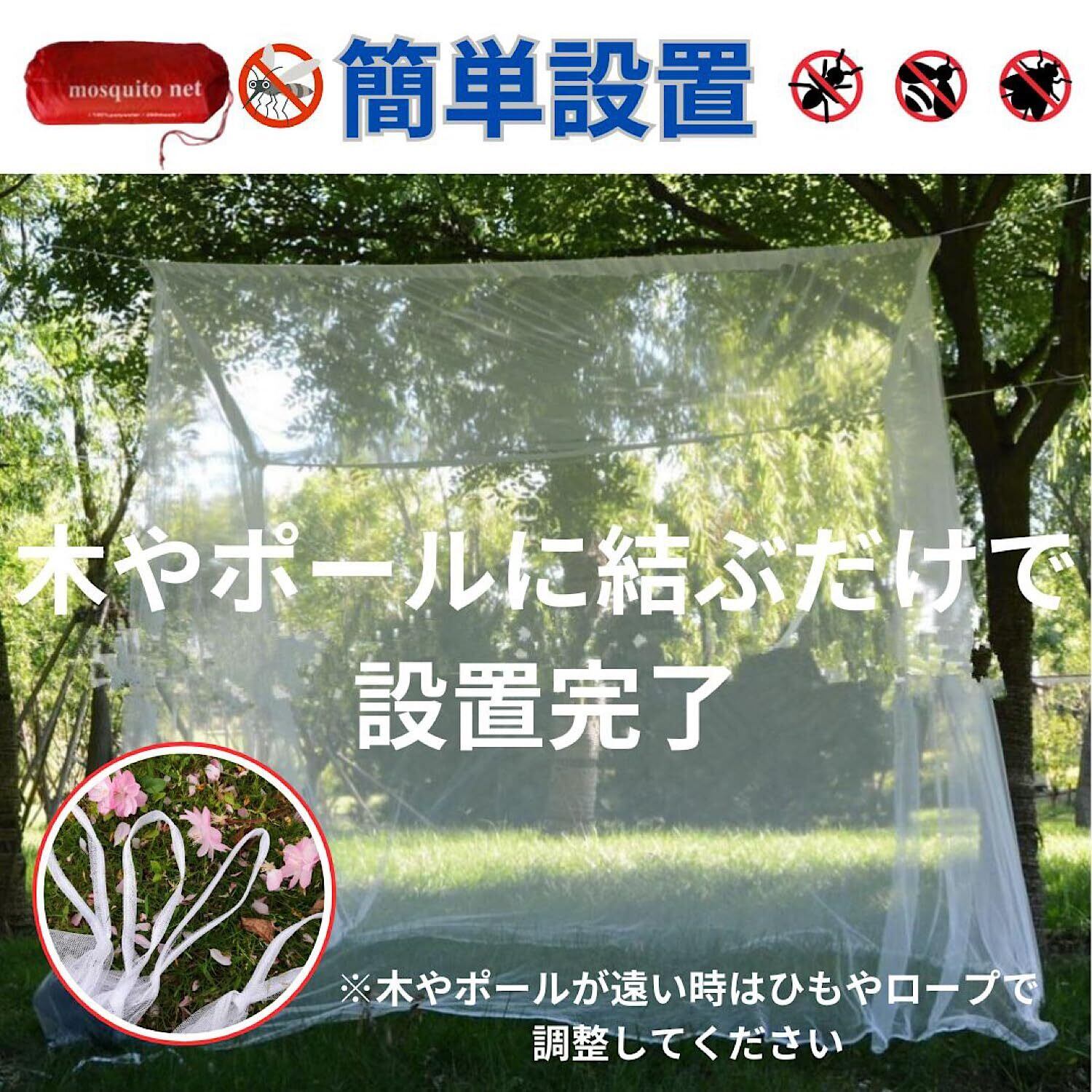 【持ち運びやすさと設置の簡単さ】蚊帳は折りたたむとコンパクトになり収納場所にも困りません。専用の収納バッグに入れて持ち運びが簡単なので、キャンプ、旅行、ハイキング、天体観測など、様々なアウトドア活動に最適です。また、木の枝やポールにひもで結ぶだけで簡単に設置でき、すぐに使用可能です。