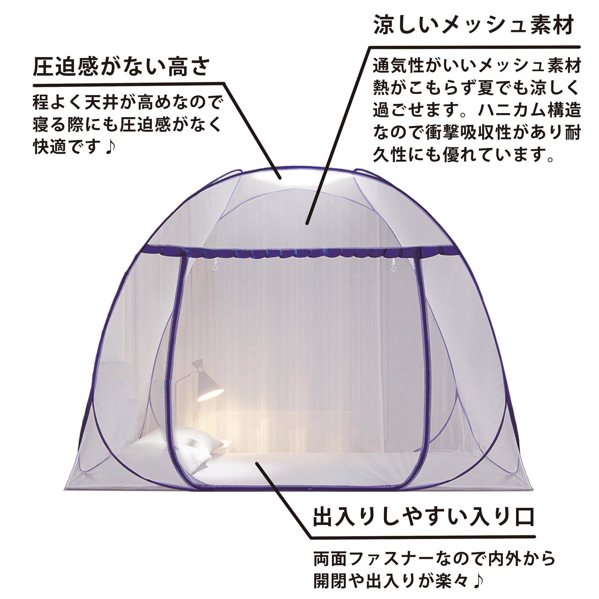 【簡単ワンタッチ式 蚊帳】ワンタッチで手間なく設置が可能なテント型の蚊帳です。寝室・ベッド用としてはもちろんキャンプ・アウトドアにも!屋外室内問わずお使い頂けるアイテムです。