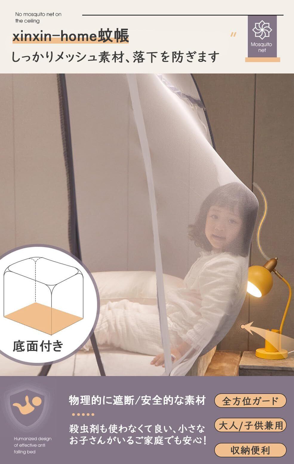 このxinxin-homeの蚊帳は、**テント式の全方位ガード構造により、虫からしっかりと守ります**!夏場のアウトドアでも安心して過ごせる空間を提供します。
