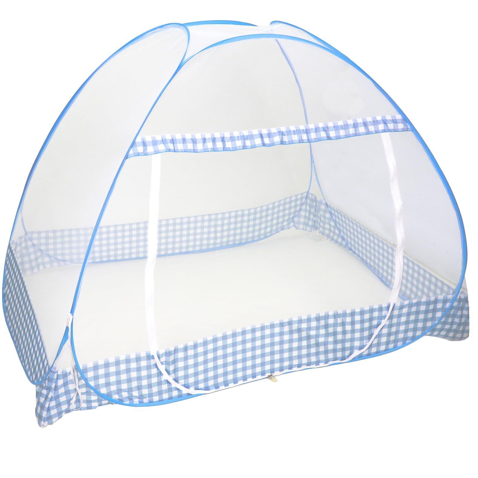 蚊帳 ワンタッチ 底付き 1ドア 蚊よけネット 虫 ムカデ対策 テント式かや 防護布付き チャック付き 折りたたみ式 網目は細かい 通気性よい 軽量 コンパクト 室内 アウトドア 旅行用 2段ベッド用 ブルー (セミダブル(約幅120x奥行き190x高さ130cm))