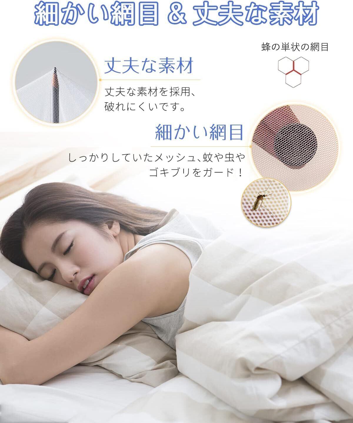 【細いメッシュ】:網目が細かいネットを採用し、小さな蚊でも通しません、嫌な蚊、虫をきっちんとガードします。ネットで通気性が良いので蒸し暑くならず快適にお過ごし頂けます。