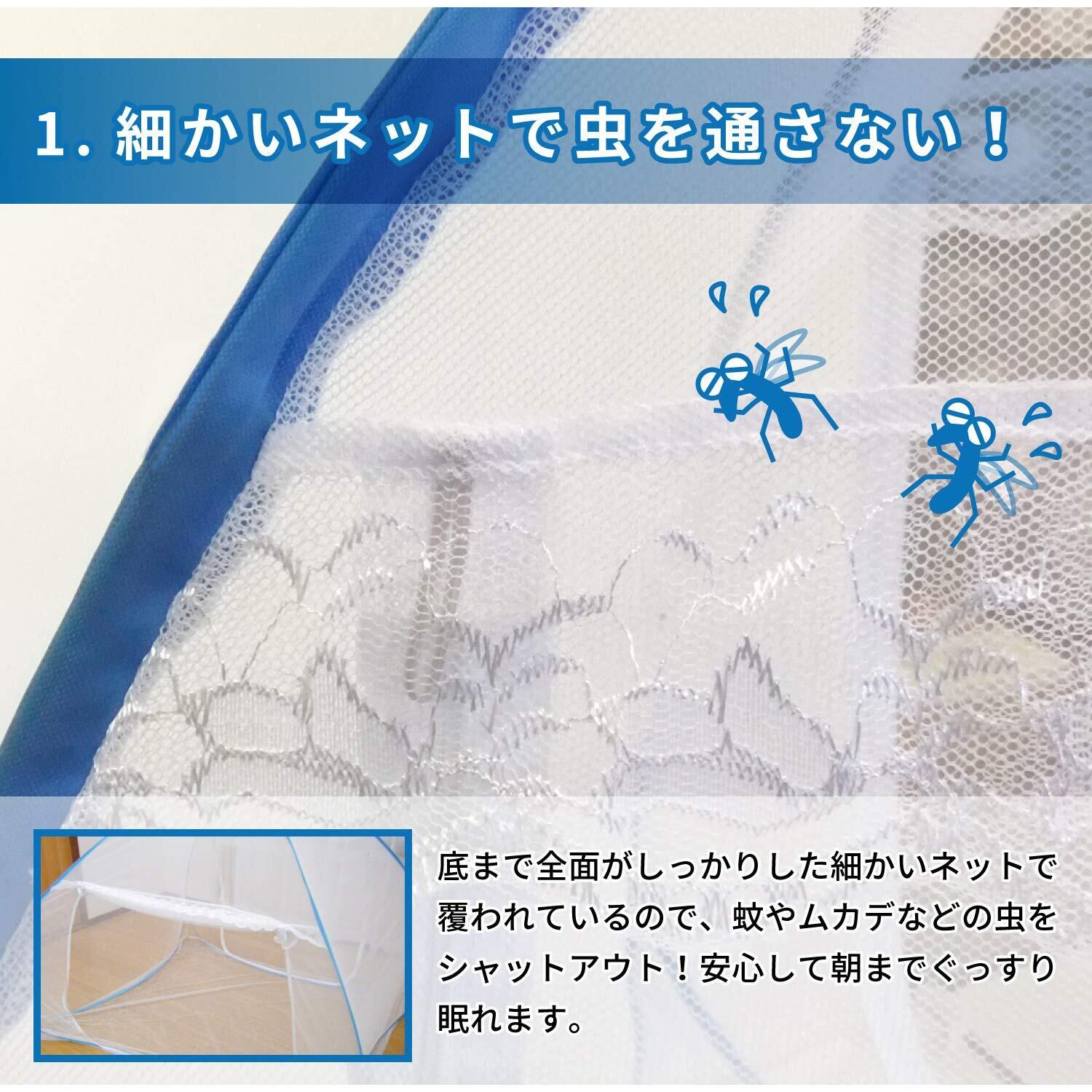 高密度メッシュが使用されており、小さな虫の侵入をしっかりと防止。特に夏場の不快な虫を寄せ付けず、安心して寝ることができます。全方位からの防蚊設計で、快適な睡眠環境を実現します。
