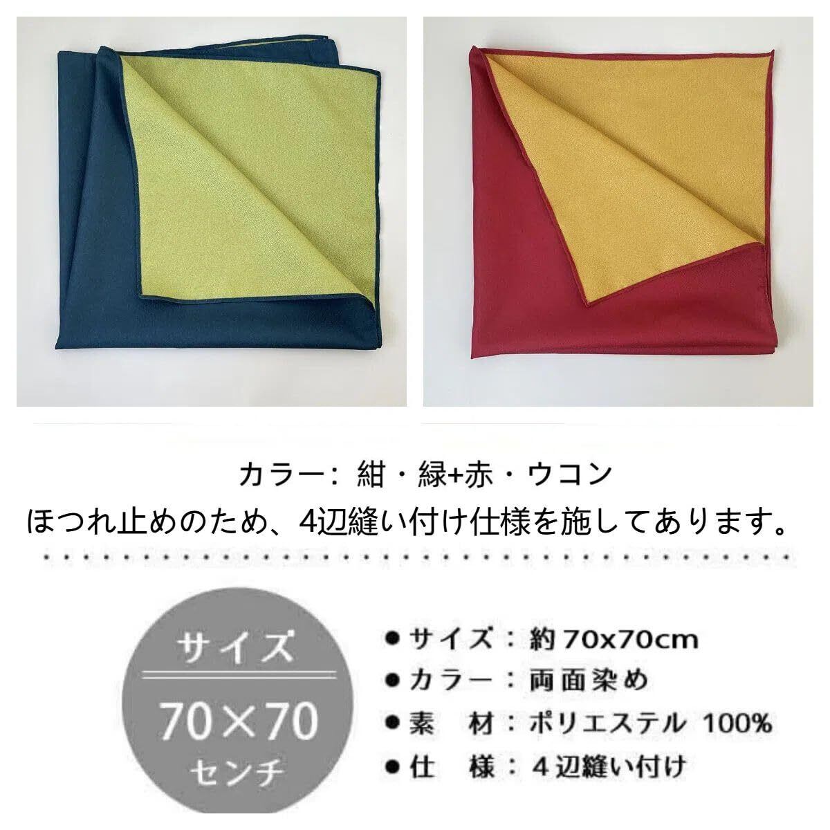 風呂敷 2枚セット ふろしき 70cm ちりめん リバーシブル 両面染め 4辺縫い付け 無地 おしゃれ 二巾 お弁当包み ギフト包み 瓶包み 着物バッグ クロス エコバッグ 朱色・ウコン/紺・緑