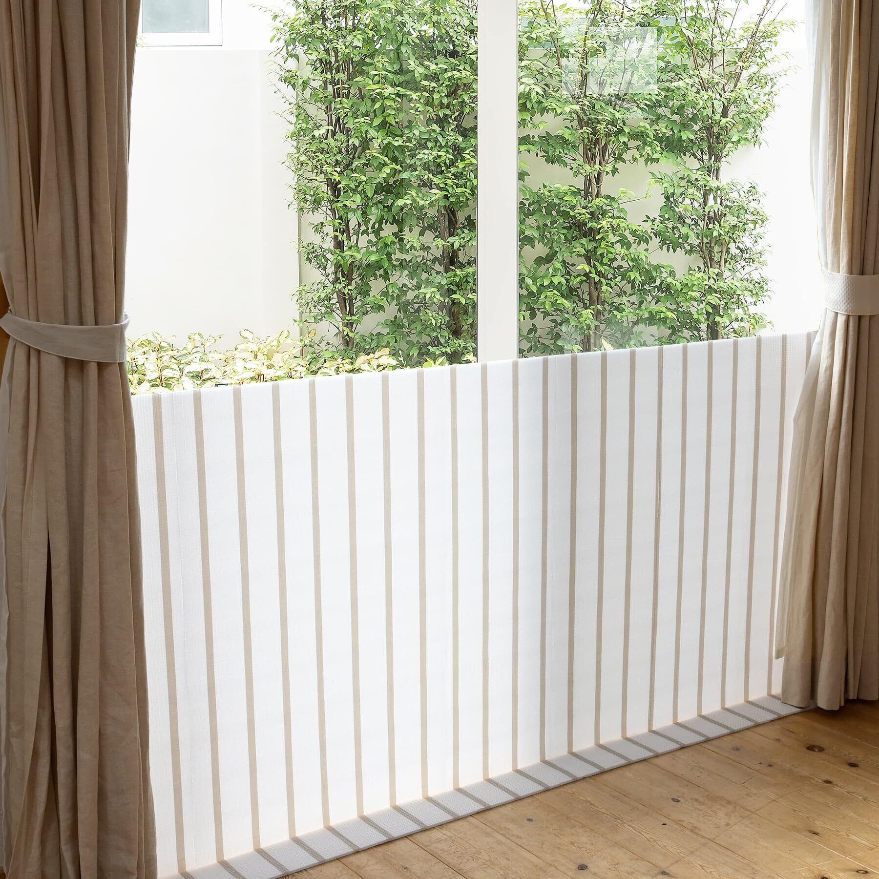 【使い方】下部の切れ目から屋内側に折り曲げて窓に立てかけます。下部を折り曲げる事で全体がフラットに近くなり、直立状態を維持しやすく屋内側に倒れにくくなります。