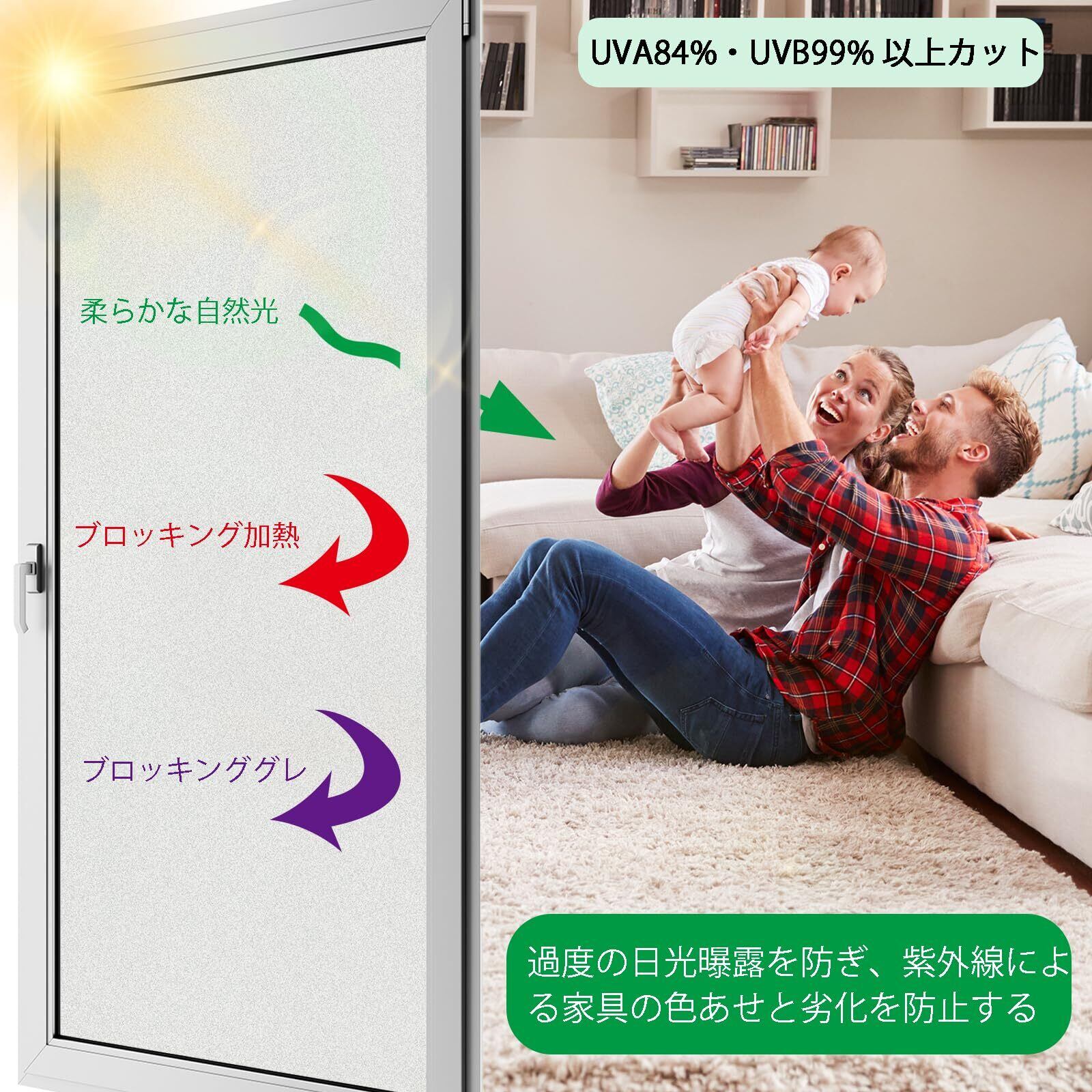 **強力なUVカット機能を備えており、室内の紫外線を防ぎます!** これにより、大切な家具やインテリアを紫外線から守りながら、快適な居住空間を保つことができます。