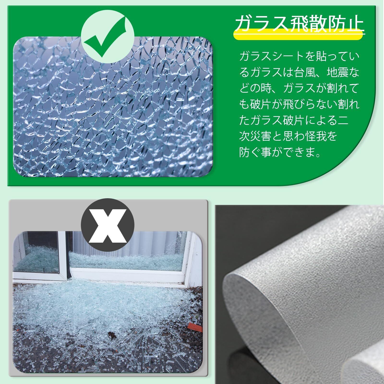 【接着剤不要・水で貼る】この飛散防止フィルム 接着剤不要(静電気吸着)なので、水だけで貼り付け、貼り直しOK!初心者の方でも簡単に貼れます。ご注意●必ずガラスフィルムについた保護フィルム(不要なフィルム)を剥してください。この手順をスキップすると、貼ったガラス窓 目隠しシートが剥がれ落ちてしまうので、ご注意くださいませ。●任意の滑らかな表面に適用できます。粗いまたは多孔性の表面には適用されません。窓遮熱シート フィルムは取り外し可能で、何度も再利用できます。ご家庭での使用に最適なオプションです