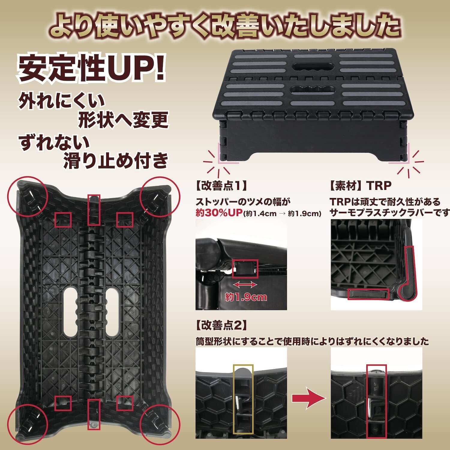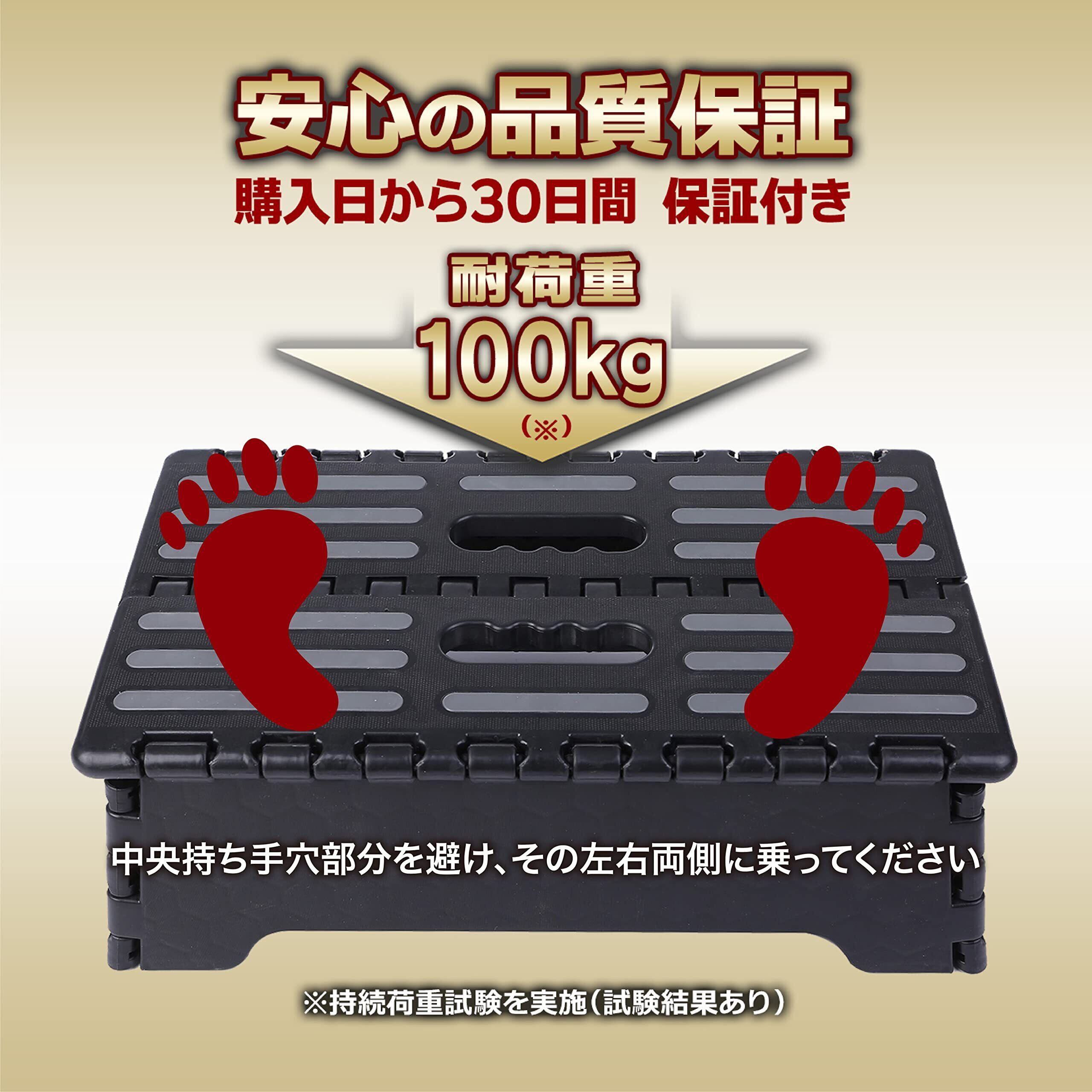 【サイズ・素材・色】:使う場合 開いた状態 (約)幅38×奥行22×高さ13cm(ご注意:高さは10cmではありません。天板中央には乗らないでください。) 折り畳み 閉じた状態: (約)幅40×高さ24×厚さ5cm、重さ(本体):約1200g、メイン素材:プラスチック、色:黒色、 滑り止め付き 改良点:両サイドの内側に折りたたむ箇所を筒型形状へ、また天面にあたるツメ幅を約1.4cmから約1.9cmへ長くすることでより安定感がアップしました。 静耐荷重:約100キロ【ご注意】中央部は持ち手を考慮した構造の踏み台となります。持ち手部分は乗らないでください。表示の数値は静荷重による耐荷重負荷試験の数値となります。衝撃力を考慮したものではありません。静耐荷重以上の荷重をかけたり、耐荷重以内での急な衝撃は与えたりしないでください。耐荷重の数値は測定値のため値ではありませんことをあらかじめご了承願い願います。踏み台に上方から天板へ飛び降りること、イスとして使用すること等は危険ですのでおやめください。添付の取扱説明書をお読みの上適切にお使いくださいませ。(※2024年7月静荷重 品質検査済み)