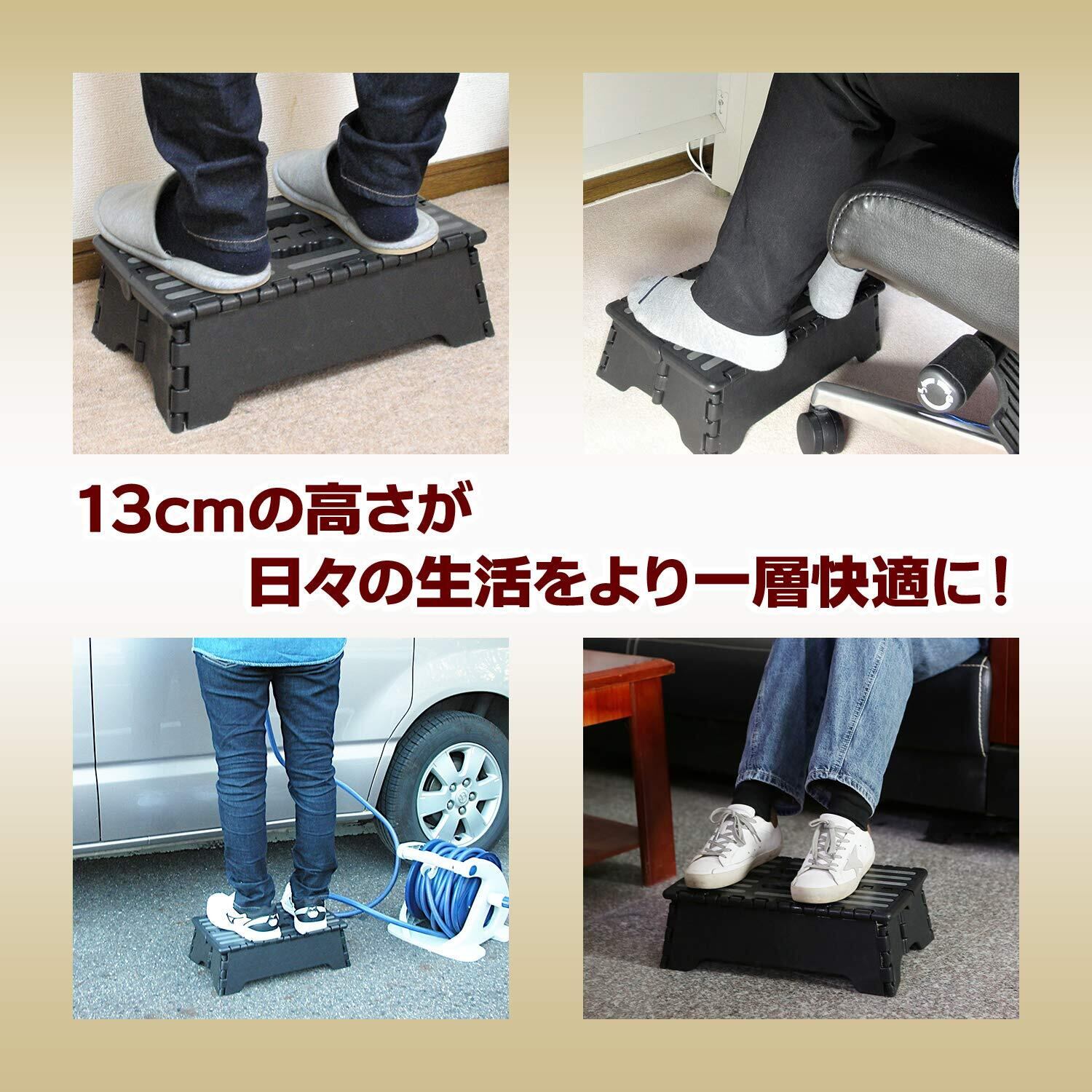 【2025年国内において静荷重の品質検査済】 踏み台を折りたたみでき車の乗り降りにもコンパクト収納可能な持ち運べる便利グッズ 低い 踏み台 足置き台。従来の滑り止め付きに新しくサイド折りたたみ箇所、ツメ幅 仕様変更により安定してお使いいただけます。高さ13cm。段差のある場所に置き、乗降ステップなどの乗り降りがしやすくなる補助ステップ。折りたためて収納がコンパクトだから椅子やデスクとの高さ調整、デスク 下の足置きとしてとっても重宝!こどもから大人の方まで日常生活をよりよくする多機能 折りたたみみ踏み台。足をのせる台の部分には汚れが目立ちにくいダークグレーの滑り止めを採用。車の乗り降り、足置きに便利な低い 踏み台 折り畳みタイプ。使い終わったあとは家具やいす、ソファ、テーブル、机、座席下など足元にさっとコンパクト収納いただける嬉しい5cm幅 軽量タイプ。折り畳み両サイドの接続部分ははずれにく丈夫な仕様のタイプになっておりますがロック機能付きではございません。天面すべりどめのゴムに製造時のヘコミがある場合がございますが、不良ではなく機能的には問題ございませんのでそのままお使いください。