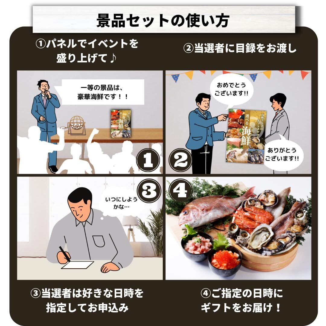 海鮮のプロが選ぶ「5000円分の高級海鮮」と交換できる、カタログギフト形式のギフトチケットです。イベントに便利な発泡スチロール製のパネルも無料でおつけします。5種類のコースから自由にお好きな海鮮をお選びいただけます。アレルギー等にも対応いたします。チケット受け取り後の配送お申し込みは、PCやスマホなどオンラインから、または付属ハガキ(切手付き)から可能です。お申し込みの有効期限は、お届け日から4か月間をしています。結婚式の二次会、ビンゴ大会、ゴルフコンペ、忘年会、新年会などのイベント景品に、福引、くじ引きなどの賞品に…さまざまな場面でとても便利に使っていただけます。