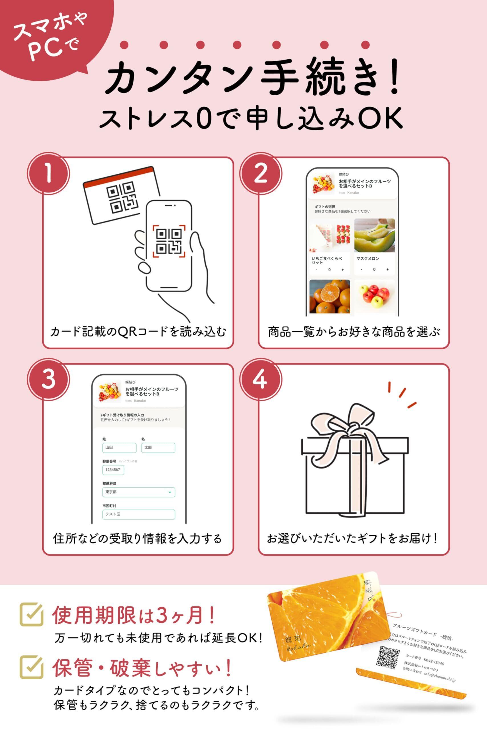 **このギフトは、カタログ形式で提供されており、受け取った方が自由に好きなフルーツを選べます!** あなたの贈り物が、特別なひとときを演出する材料と成ります。