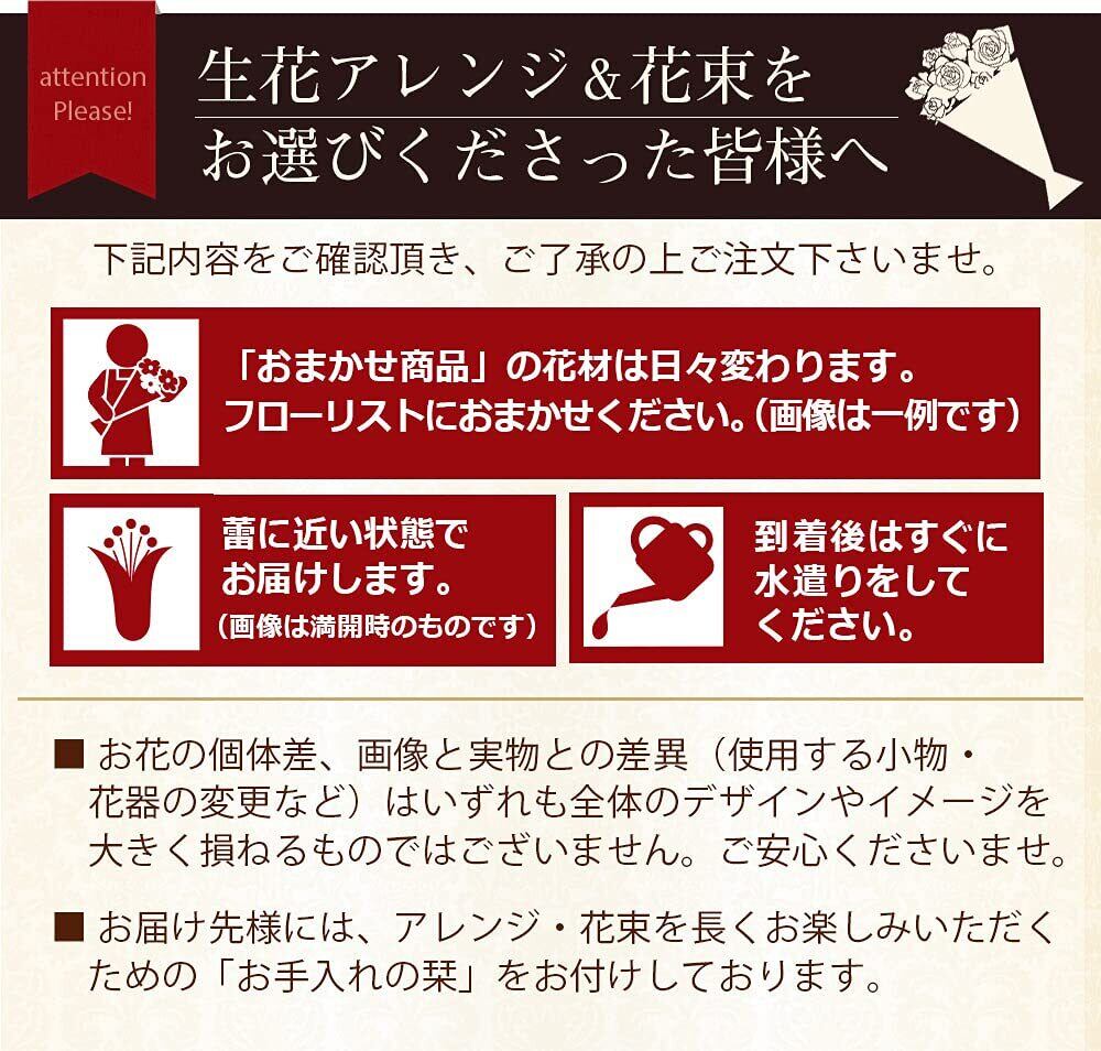生花の特性上、お届け後は早めに水を替えていただき、直射日光の当たらない場所で保管することをおすすめします。