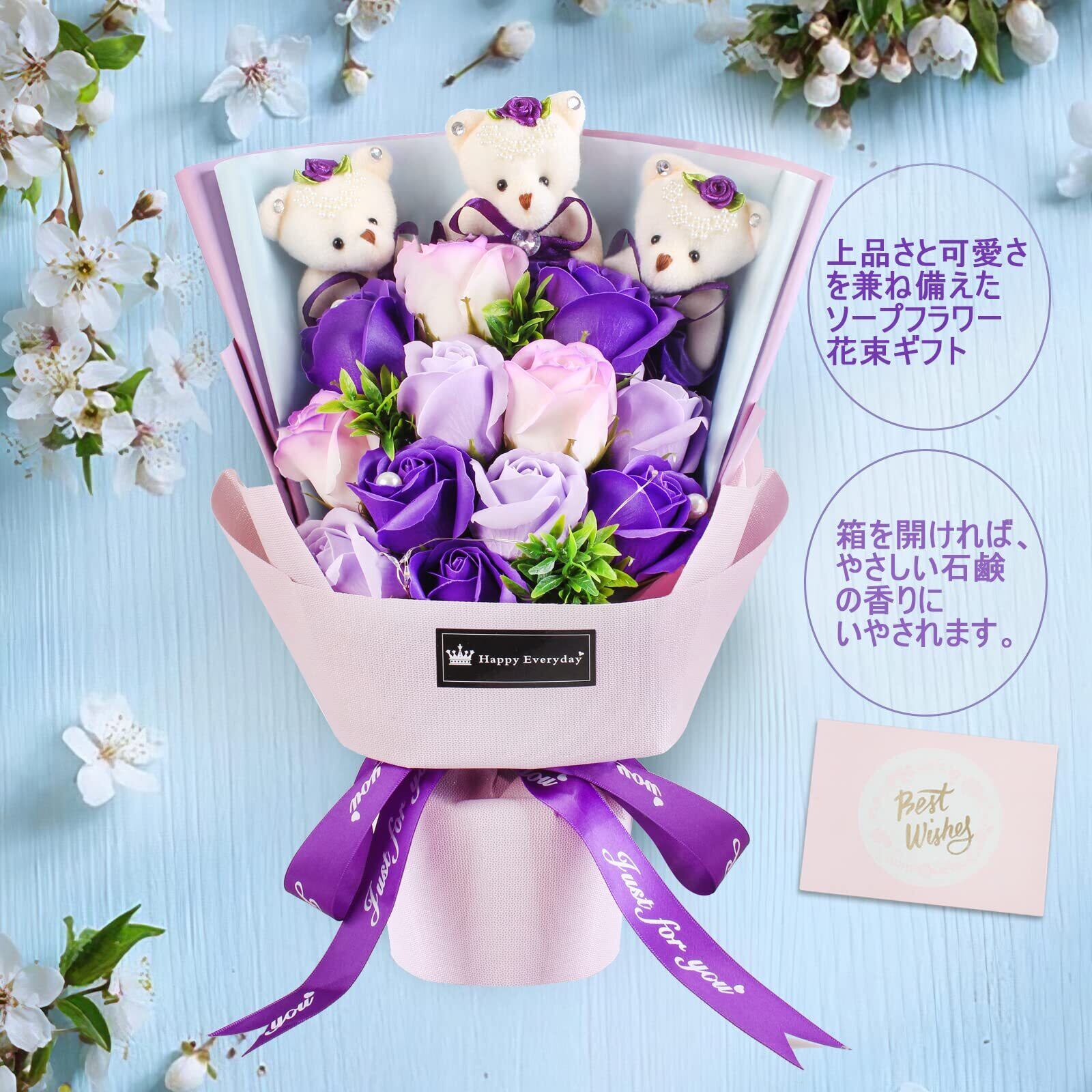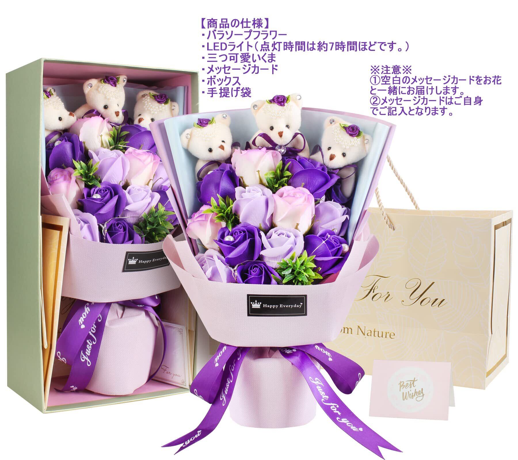 ソープフラワー 花束 ギフト くま LEDライト付き ボックス入り バレンタインデー ホワイトデー 母の日 誕生日 記念日 敬老の日 退職祝い 還暦祝い ギフト 人気 発表会 入学式 昇進 新築祝い 開店祝い 卒業祝い お見舞い プレゼント パープルバラ メッセージカード付き 2023年発売 (花束ー紫)