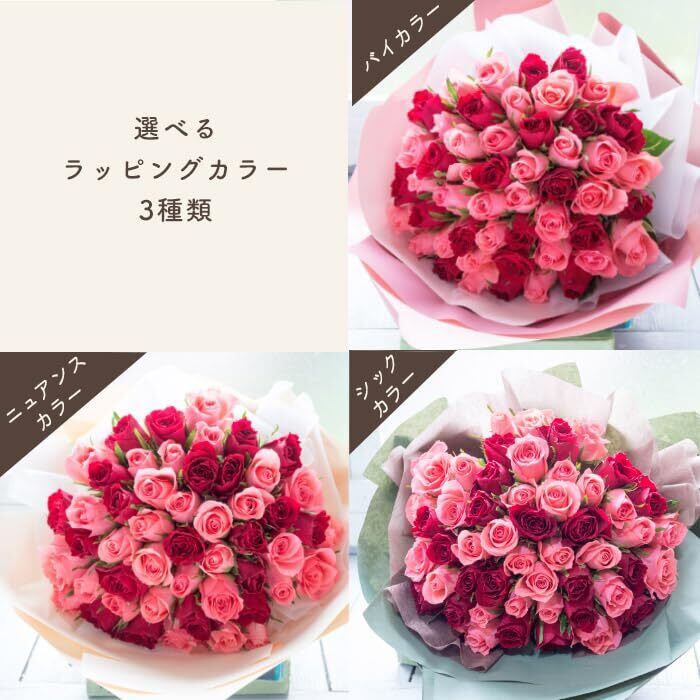 この「バラ50本の花束」は、**鮮やかなレッドと柔らかなピンクのバラをミックスした美しいフラワーギフトです!** 誕生日や記念日、プロポーズなど、特別な瞬間を美しく彩る贈り物として最適です。