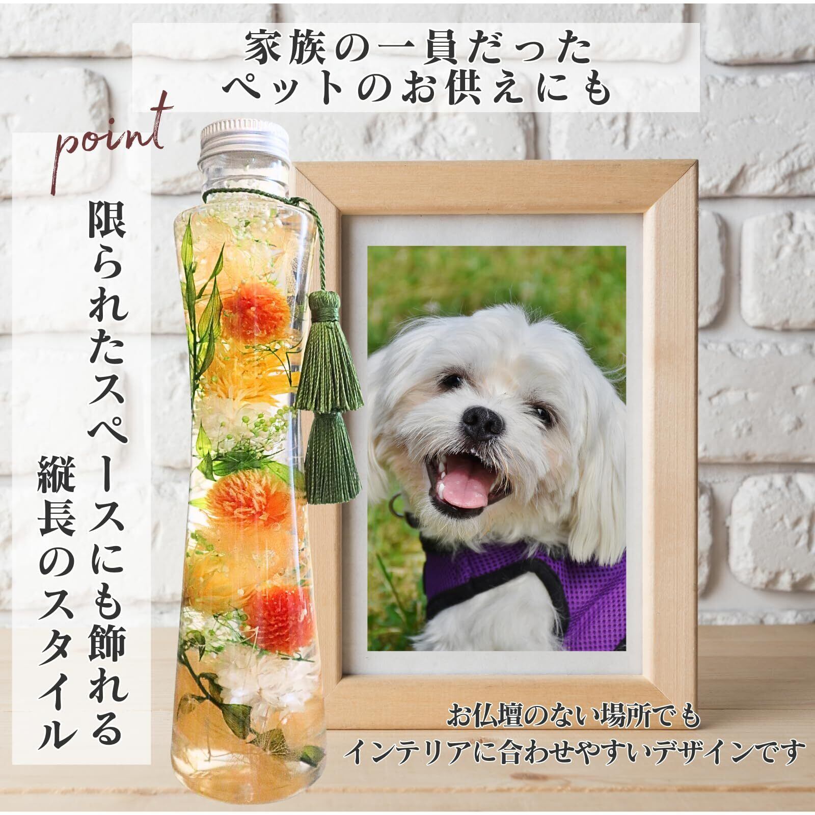 **この美しいハーバリウムは、お供え用のアイテムとしてだけでなく、日常のインテリアとしても素敵に映えます!** どんなお部屋にも溶け込み、穏やかな気持ちをもたらすアイテムです。ご自宅や大切な場所で、思い出を色鮮やかに留めることができます。