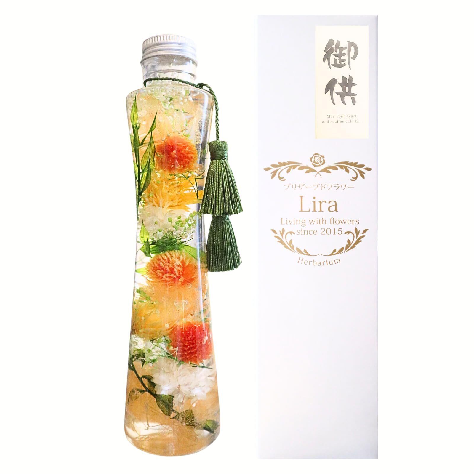 この「プリザーブドフラワーLiraハーバリウム」は、**美しいオレンジ色の花々を使用した、お供え用の特別なハーバリウムです!** 故人を偲ぶために、心を込めて作られており、仏壇やお悔やみに最適なアイテムです。