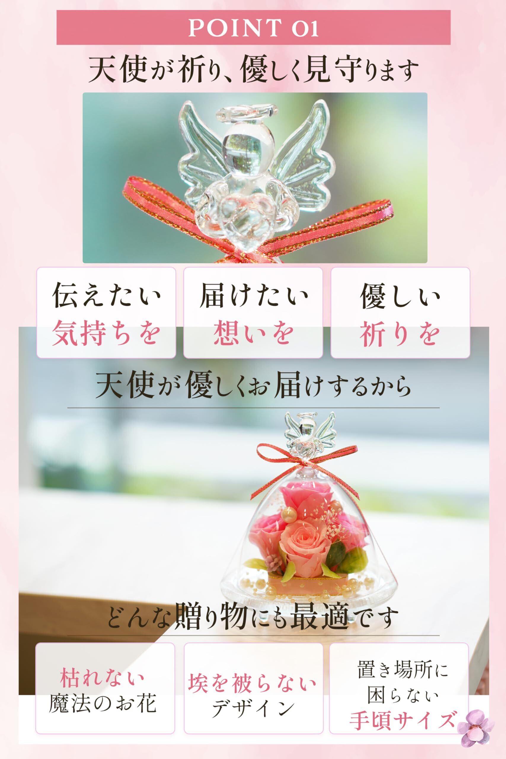 **ガラスドームに美しい花々が閉じ込められ、その姿は永遠に変わることなく楽しめます!** 特に、エンジェルデザインが施されたドームは、見る人の心を和ませ、幸福感をもたらします。透明なドームが光を受け止め、幻想的な雰囲気を生み出します。