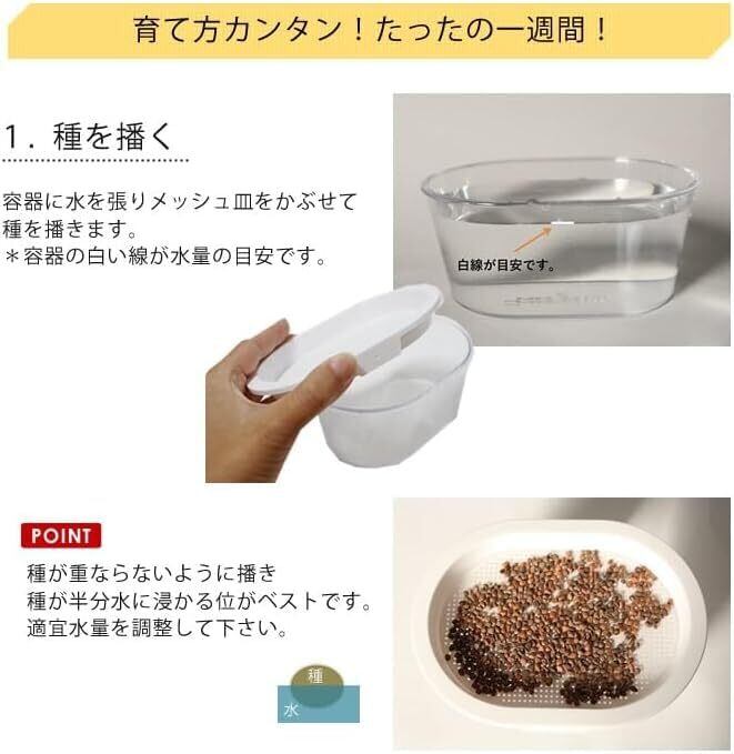 育て方:①容器の指定位置まで水を入れ、網の上にタネを重ならないように播きます。 ②暗所に置き、種が乾燥しないように水を与えながら発芽を待ちます。(2-3日で発芽) ③発芽した後、食べ頃になったら日光に当てて緑化しましょう!7-10日後に収穫です!