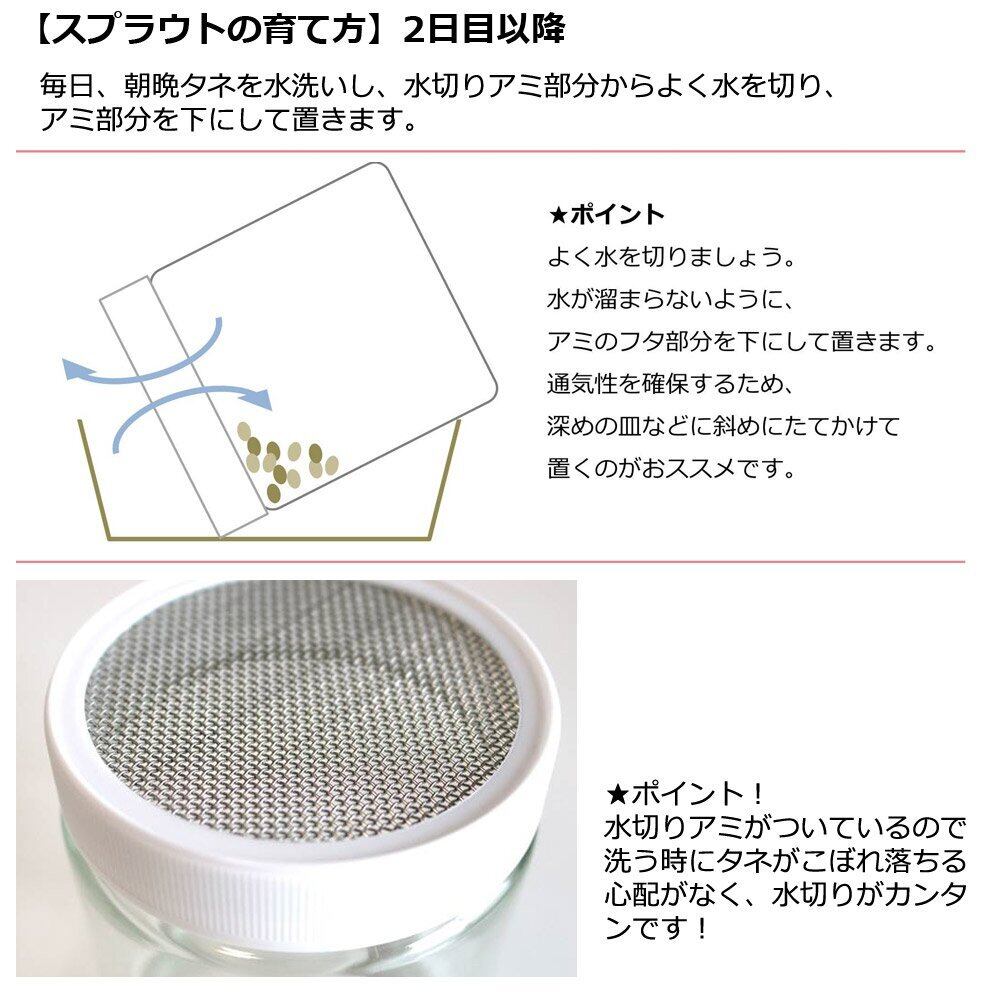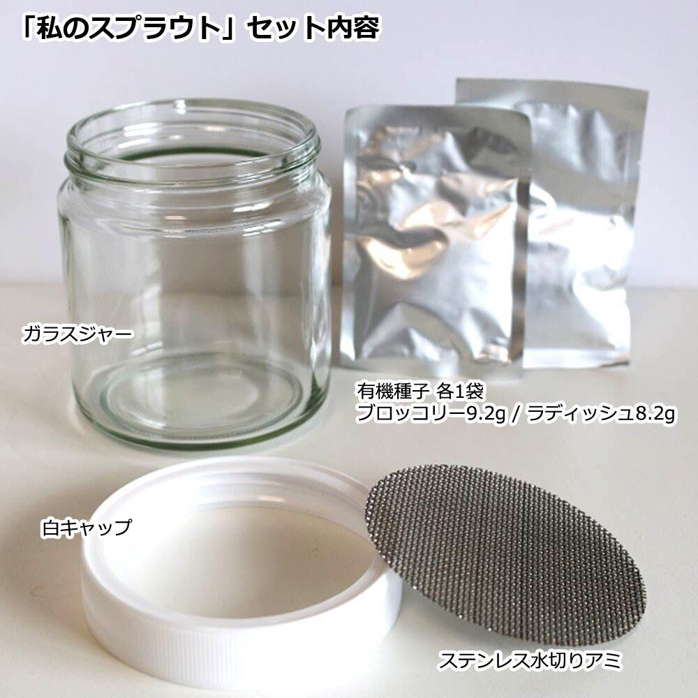 セット内容:ガラス容器[外寸(直径90×高105mm/450mm)]、プラスチック白キャップ、ステンレス水切りアミ、ブロッコリー有機種子1袋(9.2g)、ラディッシュ有機種子1袋(8.2g)