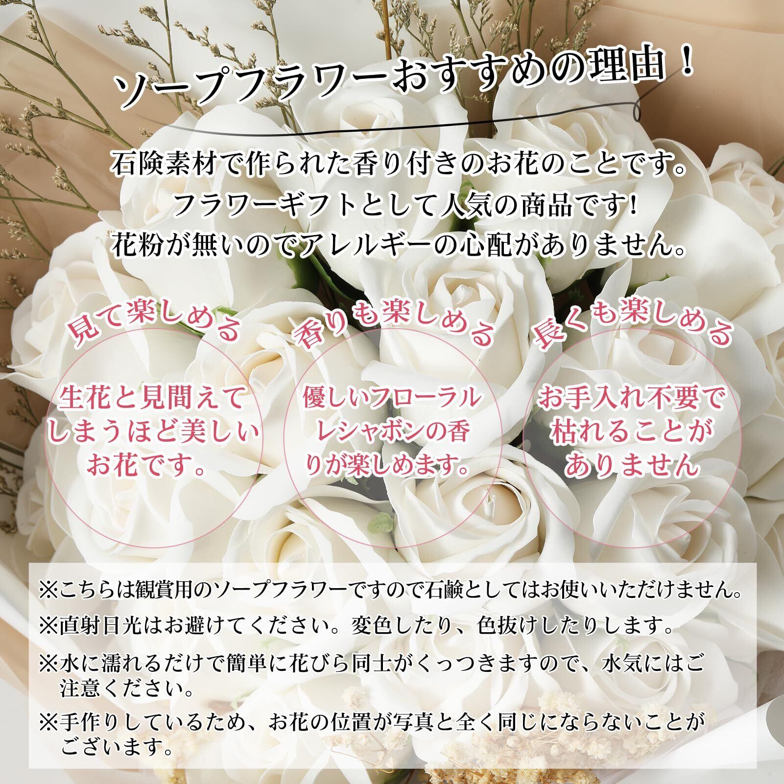 ② ソープフラワーが選ばれる理由:1.手入れ不要で枯れない!長く美しさを楽しめます。2.プリザーブドフラワーよりボリュームたっぷり。3.鮮やかな色彩と優しい石鹸の香りで癒されます。4.花粉がないため、アレルギーの心配が不要。5.見た目も香りも楽しめる理想のフラワーギフト。