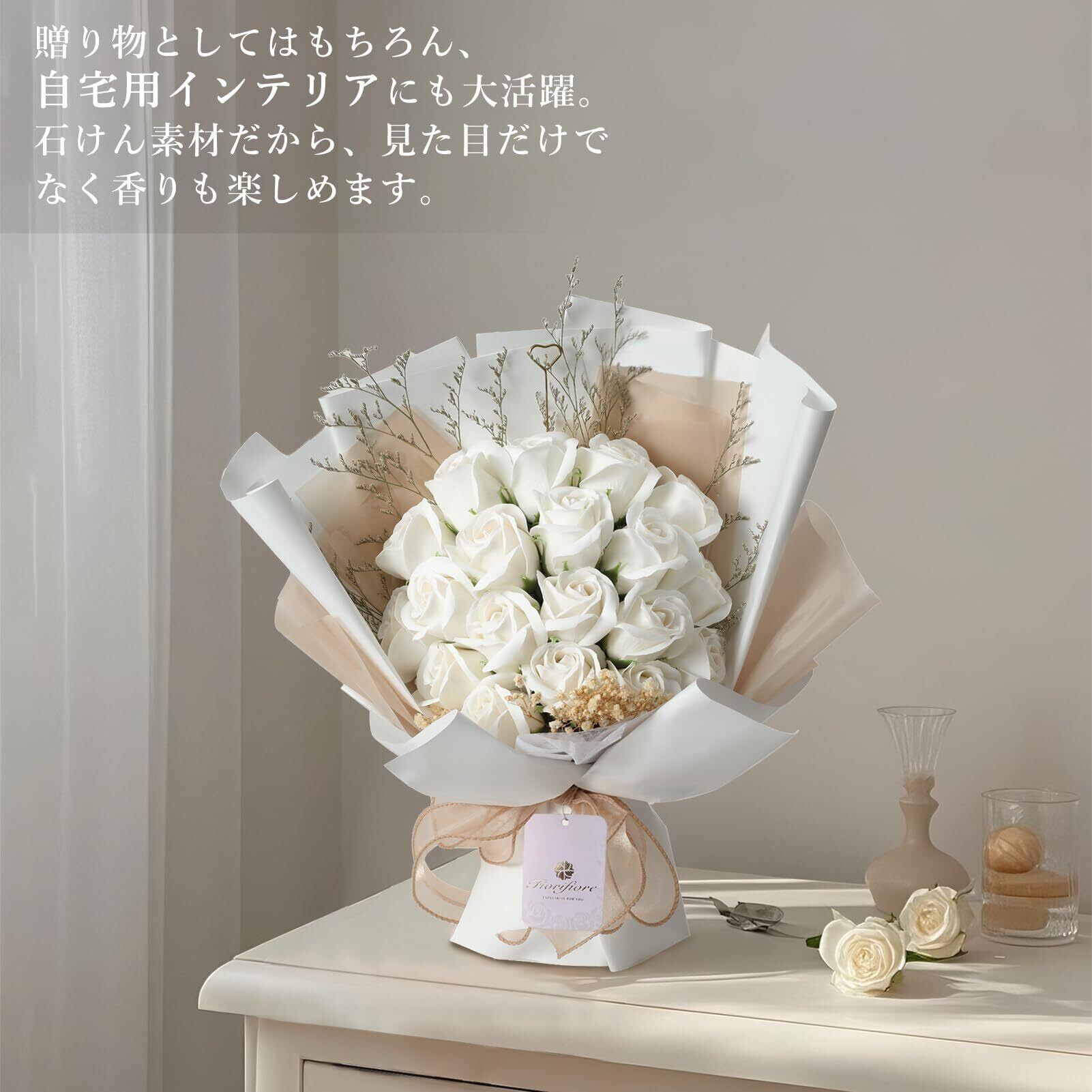 「ソープフラワー花束」は、**美しく華やかなデザインと香りで、特別な瞬間を演出するためのアイテムです!** 贈答用としてもちろん、自分自身へのご褒美にもぴったりです。