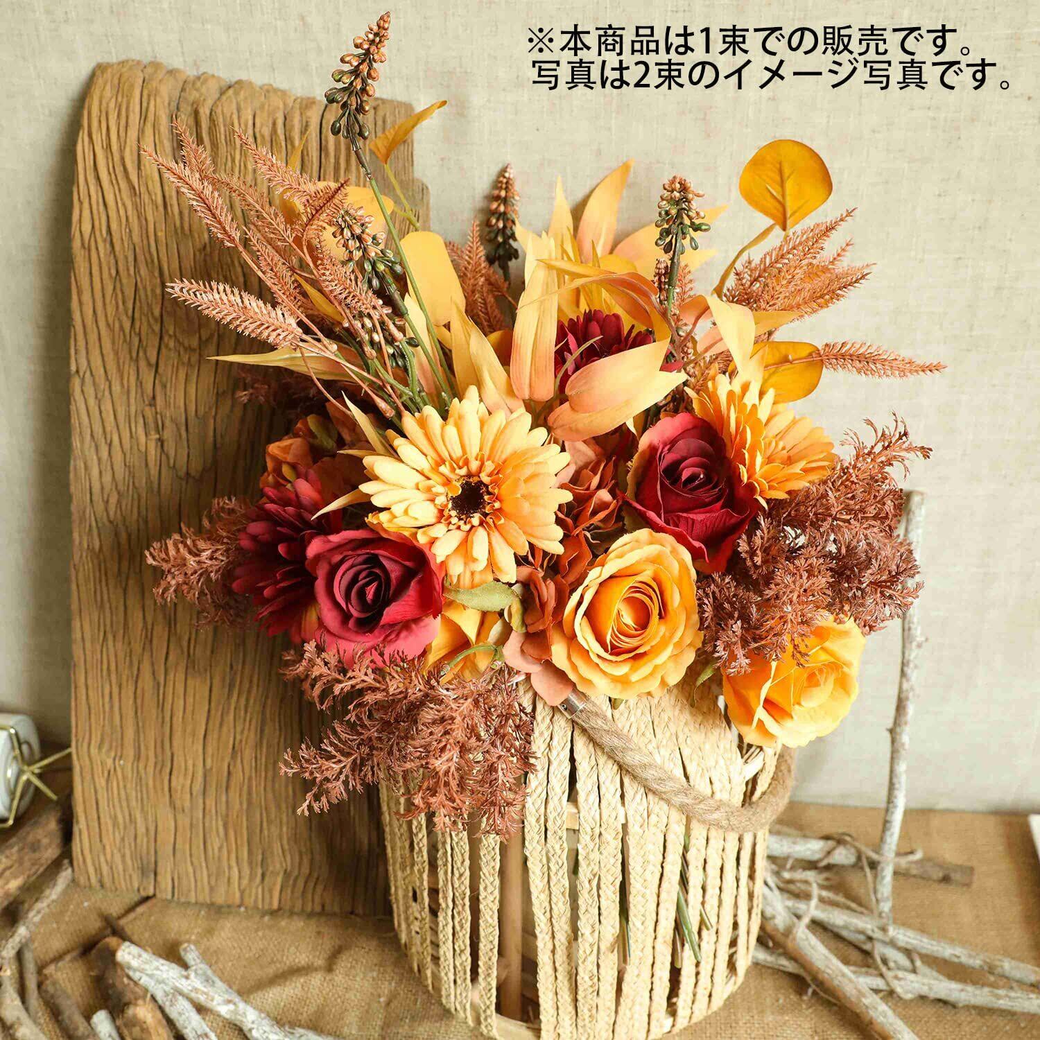 「ドライフラワー 花束」は、**美しいオレンジ色のバラや菊を使い、リアルな質感を持ちながら、いつでも楽しむことができます!** 秋の季節感を失わず、さりげなくインテリアに溶け込みます。