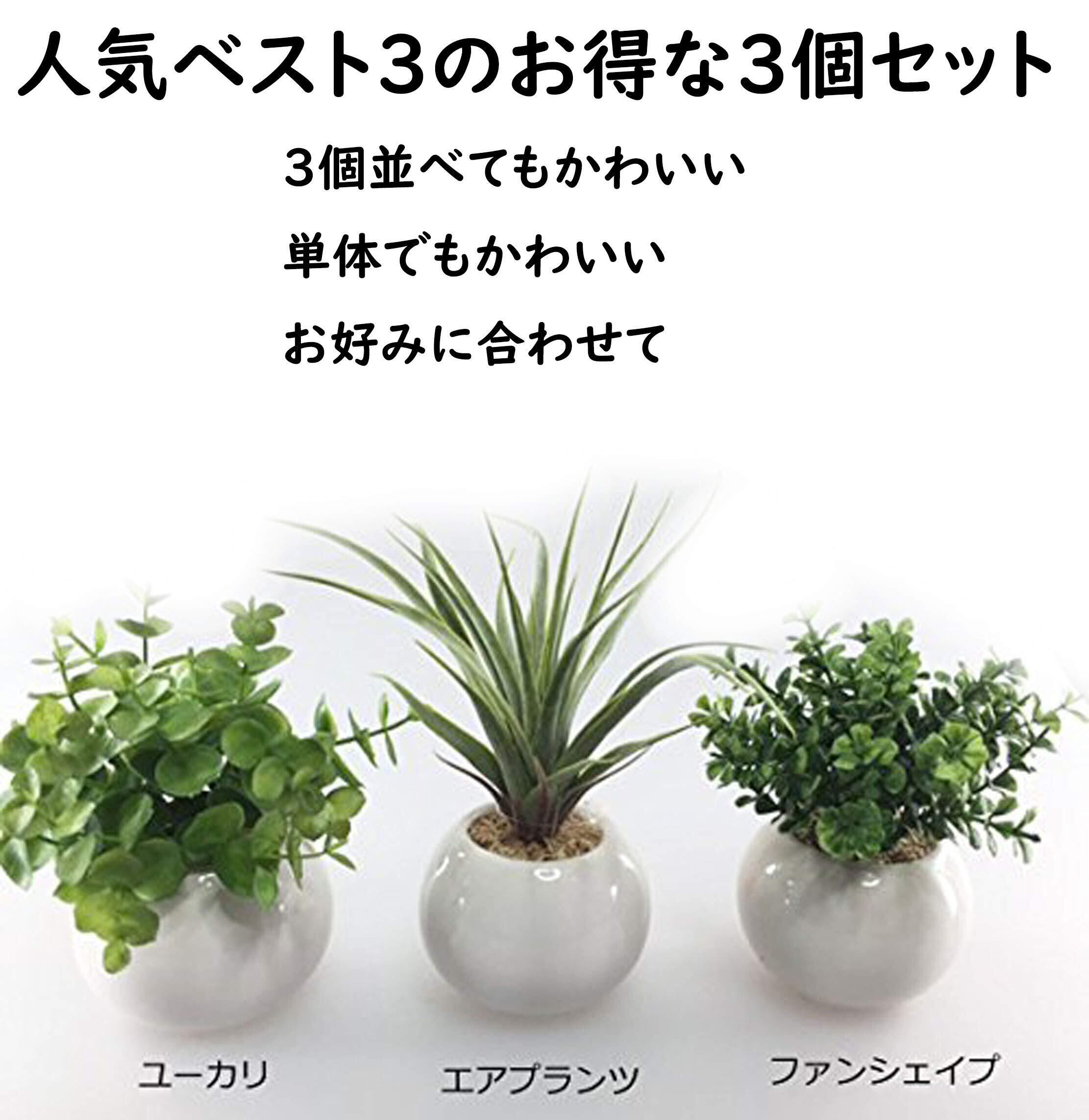 ミニ インテリアグリーン 造花 観葉植物 ユーカリ、エアプランツ、ファンシェイプ グリーン 3点セット