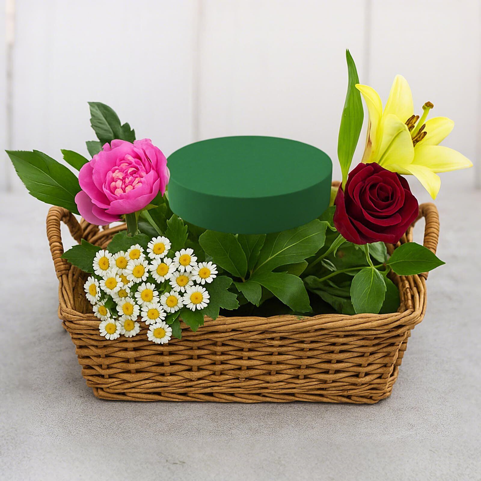 吸水性スポンジを水に浸してから、花やグリーンを思いのままに配置してください。アレンジメントを完成させれば、華やかで心温まるディスプレイが出来上がります。特別な日の演出や、日常のインテリアとしてもお楽しみいただけます。