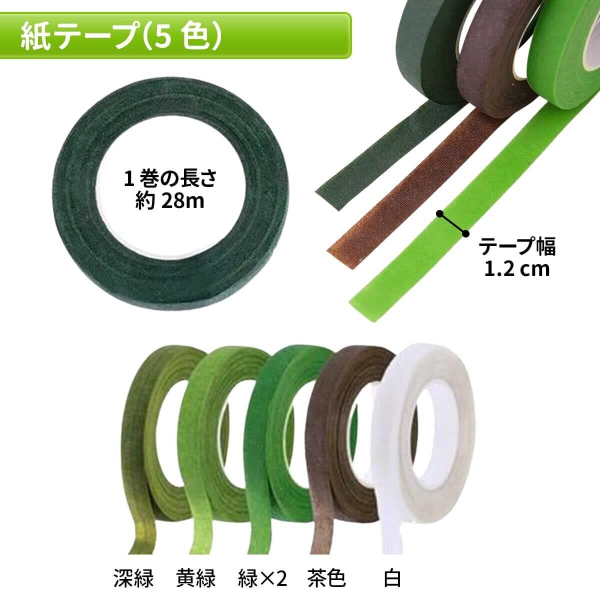 **8種類のフローラテープが含まれ、色を自由に使い分けられるのが魅力です!** 各テープは幅約12mm、長さ約20メートルで、たっぷり使える量が嬉しいポイントです。思い描いた理想のアレンジメントを実現するために、ぜひこのセットを活用してください。