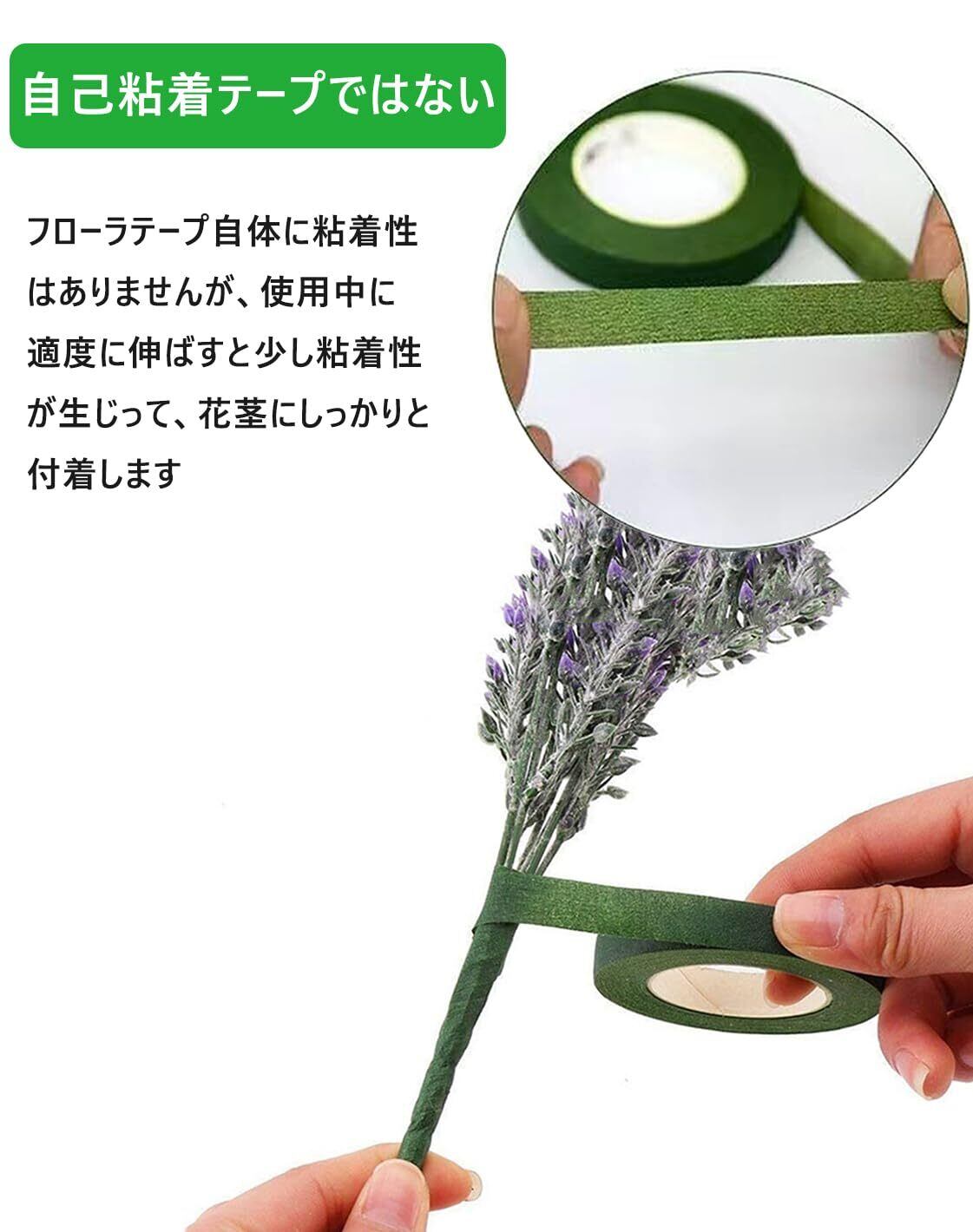 【使用方法】まず、枝と似た色のテープを選び、やや伸ばして粘着性を高め。そして、テープを伸ばしながらゆっくりとブーケに巻き付け。最後に、余分な部分を切り取る(脱落しないように最後にテープも少し伸ばして粘着性を高めることにご注意ください)。