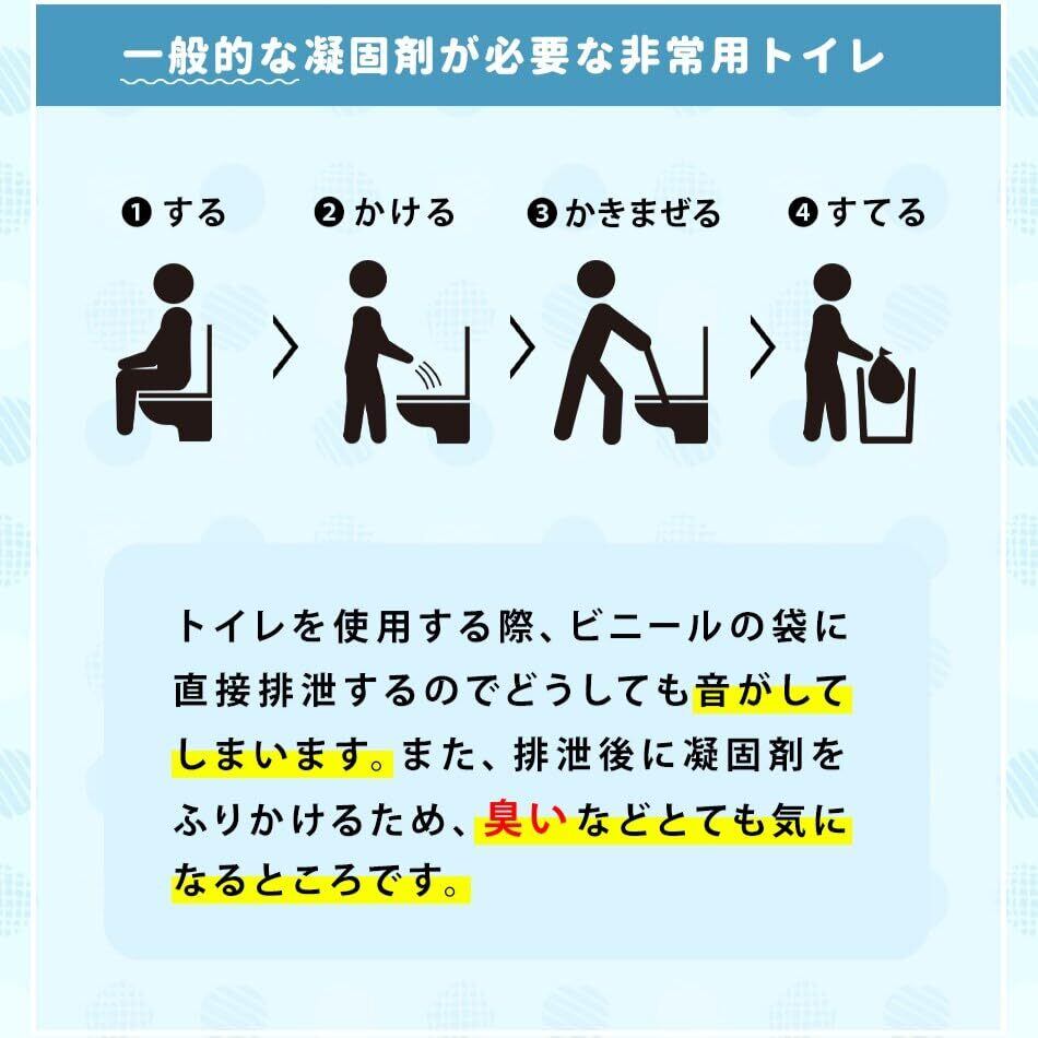 凝固剤不要|広げるだけですぐ使える 袋内に吸水シートを圧着済みなので、一般的な非常用トイレのように凝固剤を振りかける必要がありません。誰でも簡単に使え、慌ただしい災害時でも安心。