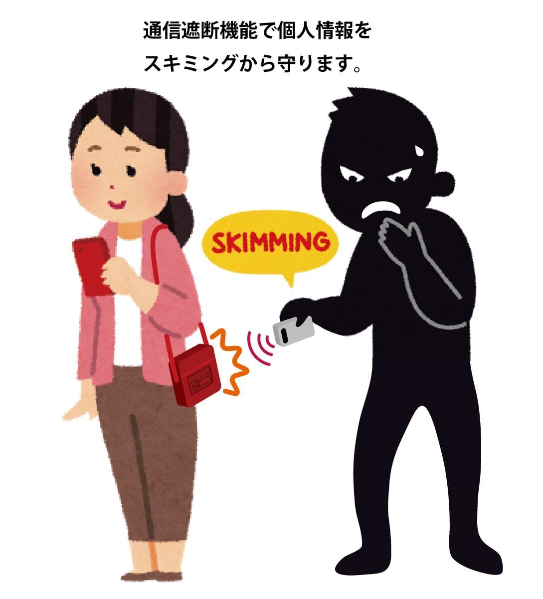 **スキミング防止素材を使用し、近距離からのデータ取得を防ぎます!** 外出先でも安心してカードを携帯でき、プライバシーをしっかりと保護します。